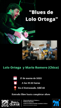 El guitarrista sevillano, uno de los fundadores de la mítica Caledonia Blues Band, Lolo Ortega, ofrecerá a las 19:30 horas en El Entramado, un recital en compañía del también guitarrista Mario “Chico” Romero. Un concierto íntimo integrado por composiciones propias; un amplio repertorio compuesto de temas originales en lengua castellana e inglés.