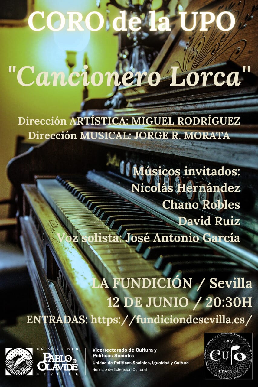 El Coro de la Universidad Pablo de Olavide presenta este lunes 12 de junio a las 20:30 horas en la Sala La Fundición (Calle Habana, 18. Sevilla) el concierto ‘Cancionero Lorca’ junto con la voz del grupo ‘091’, el solista José Antonio García con motivo del 125º aniversario del nacimiento del poeta andaluz Federico García Lorca el 5 de junio de 1898 en Fuente Vaqueros (Granada).