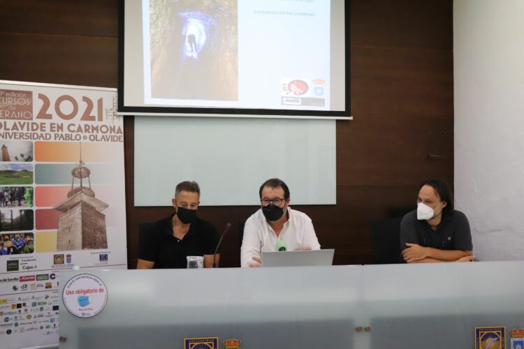 El alcalde de Carmona, Juan Ávila Gutiérrez; el arqueólogo municipal, Juan Manuel Román Rodríguez y el presidente de la Asociación Andaluza de Exploraciones Subterráneas, José Millán Naranjo, han participado hoy en el acto de inauguración del curso ‘Introducción a la Espeleoarqueología aplicada: el estudio de las minas de agua. 2ª edición’, un seminario dirigido por el arqueólogo y el espeleoarqueólogo y que se celebrará hasta el próximo miércoles 28 de julio en el marco de la XIX edición de los Cursos de Verano de la Universidad Pablo de Olavide en Carmona.