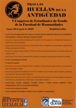 Tras las Huellas de la AntigüedadDurante el V Congreso ‘Tras las Huellas de la Antigüedad’ que comienza hoy a las 16 horas, estudiantes de la Facultad de Humanidades presentarán sus Trabajos Fin de Grado que giren en torno al Mundo Antiguo desde cualquiera de las disciplinas humanísticas. La actividad se encuentra organizada por la Revista Itálica y la Facultad de Humanidades de la Universidad Pablo de Olavide y será presentada por su Decana, Rosario Moreno Soldevila, y por Manuel Alejandro González Muñoz, gestor y coeditor de la revista creada para la difusión de jóvenes investigadores del Mundo Antiguo.
