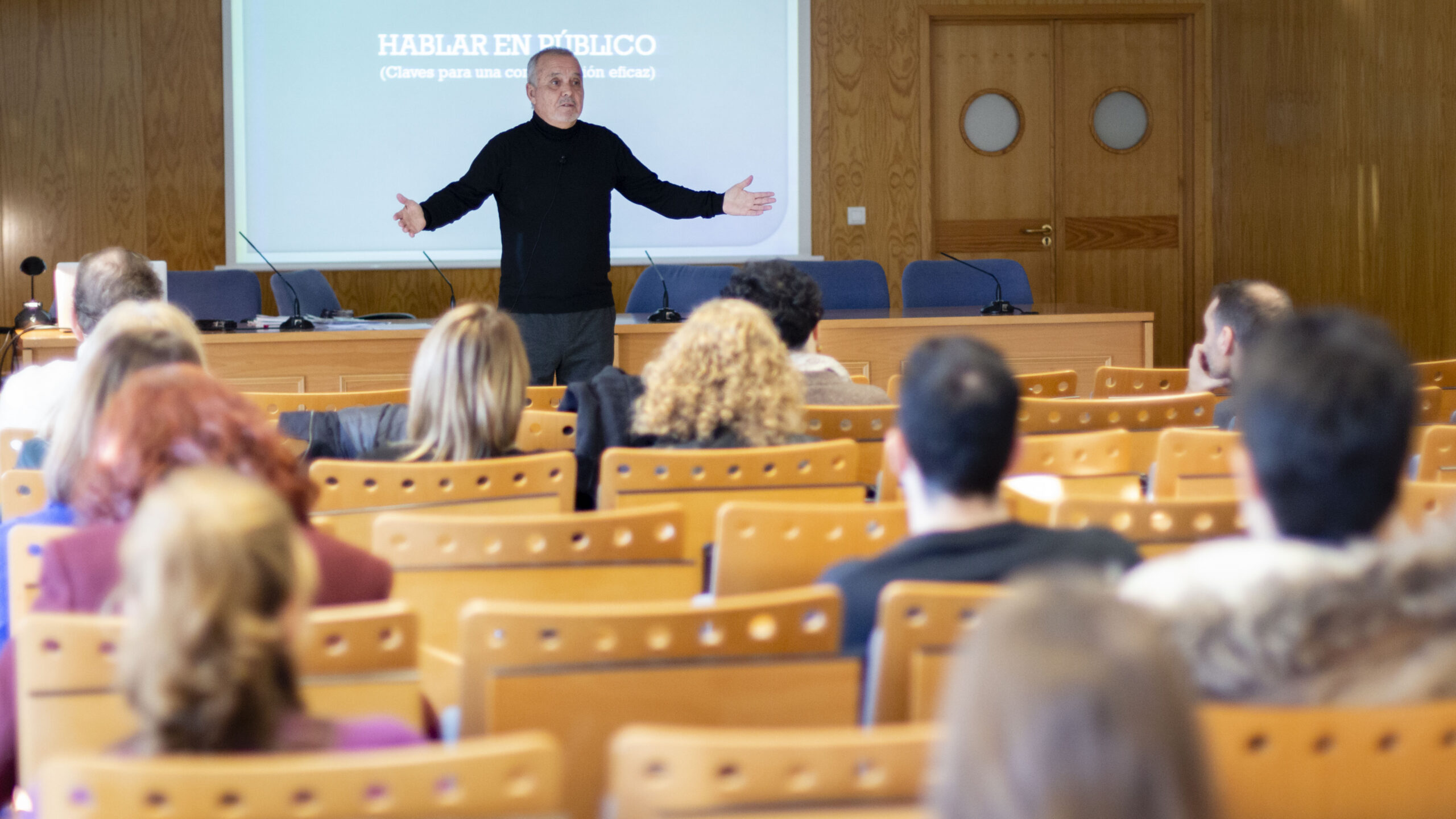 Durante la presentación del taller, Tom Martín Benítez ha señalado “la necesidad de estructurar el contenido que se quiere transmitir. Se trata de poner un espejo ante vosotros y vosotras para que aquello que sabéis, llegue mejor. No os digo lo que tenéis que decir, sino cómo lo tenéis que decir”, ha subrayado. Además de la importancia de la empatía con el auditorio, el periodista ha destacado que se puede mejorar la preparación y la confianza con el objetivo de desarrollar una comunicación más clara y, con ello, ganar eficacia. “No es lo mismo hablar que comunicar. Todos nos comunicamos, otra cosa es cómo lo hacemos”, ha asegurado.