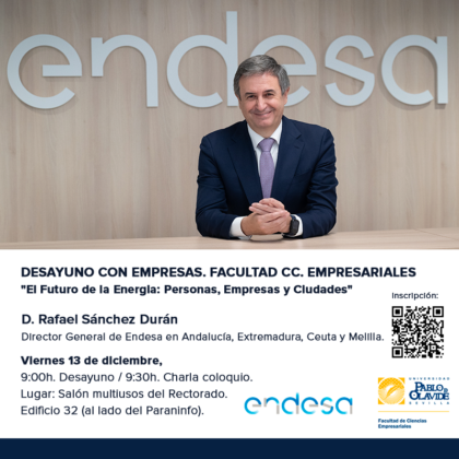 ‘El futuro de la energía: personas, empresas y ciudades’ es el título de la charla coloquio que ha impartido esta mañana Rafael Sánchez Durán, director general de Endesa para Andalucía, Extremadura, Ceuta y Melilla desde 2020, función que compatibiliza con su labor como profesor e investigador en la Universidad de Sevilla.