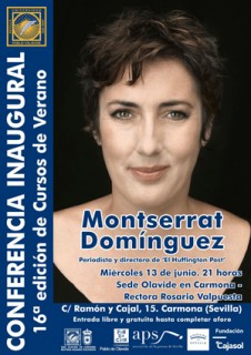 La periodista Montserrat Domínguez –directora de las revistas ‘SModa’, ‘Icon’ ‘Buena Vida’ y ‘El País Semanal’– impartirá la conferencia inaugural de la XVI edición de los Cursos de Verano de la Universidad Pablo de Olavide, que llevará por nombre ‘Mujeres, poder y medios’. El acto tendrá lugar hoy miércoles 13 de junio a las 21:00 horas en el patio de columnas de la Sede Olavide en Carmona – Rectora Rosario Valpuesta (Casa palacio de los Briones. C/ Ramón y Cajal, 15). A dicho acto asistirá también el rector de la Universidad Pablo de Olavide, Vicente Guzmán Fluja; el alcalde de Carmona, Juan Ávila Gutiérrez; la presidenta del Consejo Social de la UPO, Amparo Rubiales Torrejón; y el presidente de la Asociación de la Prensa de Sevilla, Rafael Rodríguez Guerrero.