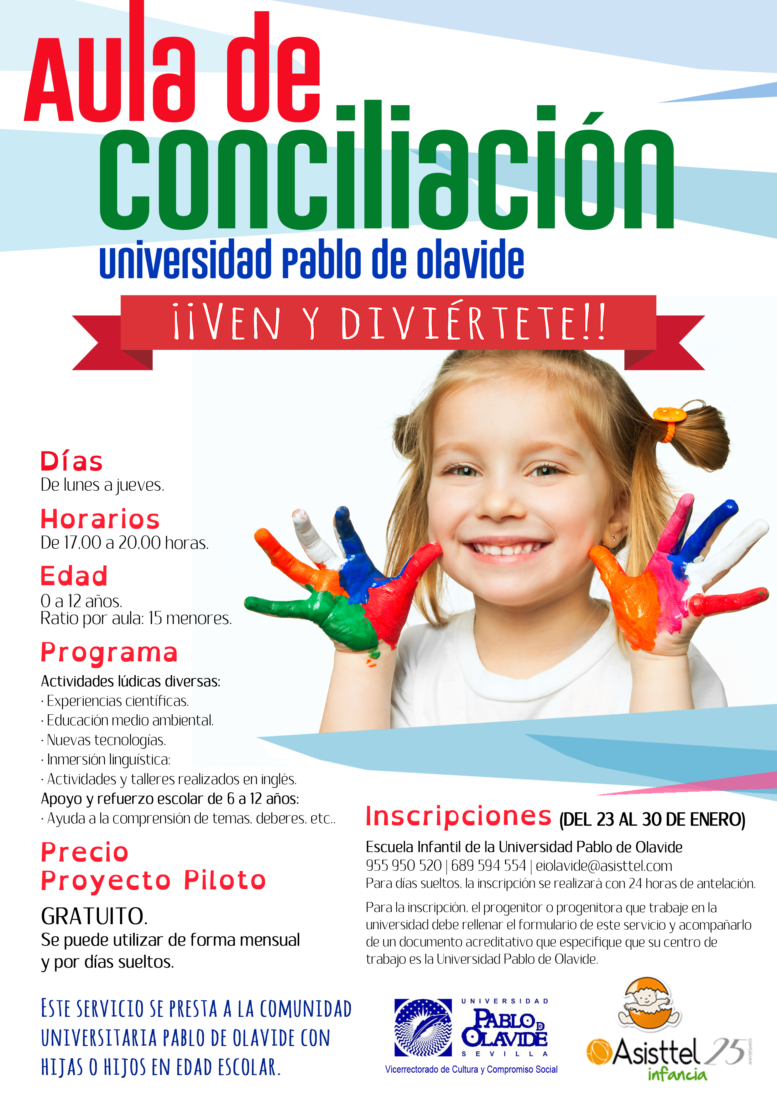 Aula de conciliación UPOLa Universidad Pablo de Olavide, a través del vicerrectorado de Cultura y Compromiso Social, pondrá en marcha durante el próximo semestre el Aula de Conciliación. Este nuevo servicio, ofrecido por Asisttel, está dirigido a todas aquellas personas que tengan su centro de trabajo en el campus de la UPO y precisen de un lugar donde menores en edad escolar, es decir, hasta los 12 años, puedan realizar actividades lúdicas y educativas en horario de tarde. El Aula estará disponible de lunes a jueves en horario de 17 a 20 horas y durante esta fase piloto será gratuita.