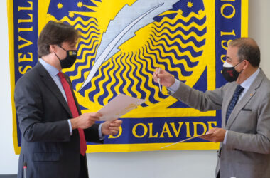 El rector de la Universidad Pablo de Olavide, Francisco Oliva, y la directora gerente de Bureau Veritas Formación, Ruth Ballesteros, han suscrito esta mañana un protocolo de colaboración para llevar a cabo actividades académicas, así como de carácter científico y técnico, además de proyectos conjuntos de investigación.