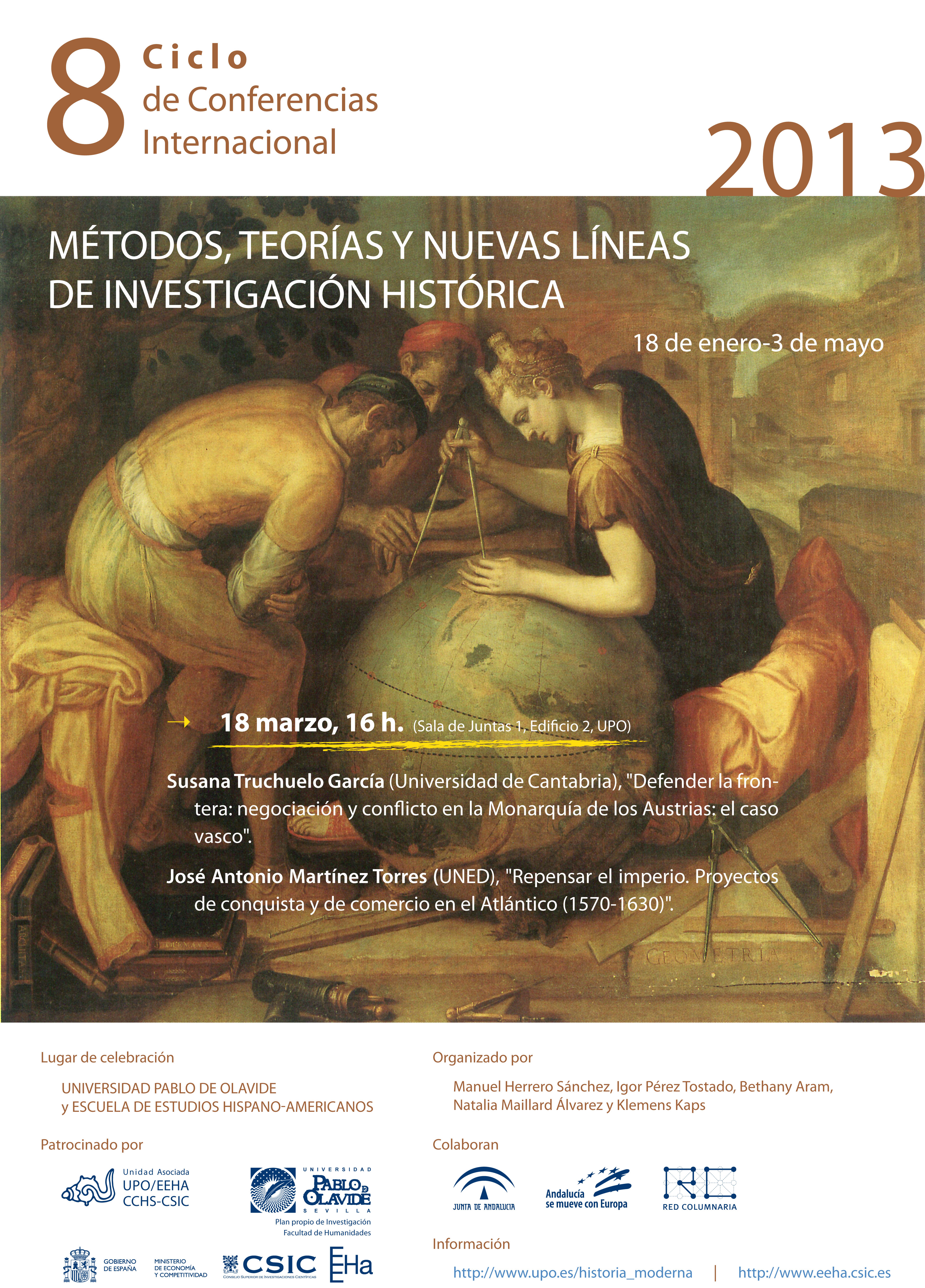La cuarta sesión del Ciclo ‘Métodos, teorías y nuevas líneas de investigación histórica’ tendrá lugar hoy lunes en la UPO, sala de juntas 1 del edificio 2. A las 16 horas Susana Truchuelo impartirá la ponencia ‘Defender la frontera: negociación y conflicto en la Monarquía de los Austrias: el caso vasco’; seguidamente, a las 18 horas, intervendrá José Antonio Martínez Torres con la conferencia titulada ‘Repensar el imperio. Proyectos de conquista y de comercio en el Atlántico (1570-1630)’.