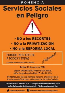 Hoy jueves 16 de enero, a las 18.30 horas, en la sala de grados del edificio 7 de la Universidad Pablo de Olavide, el presidente de la Asociación de Directores y Gerentes de Servicios Sociales, José Manuel Ramírez Navarro, impartirá la ponencia “Servicios sociales en peligro” en la que abordará la situación actual de los servicios sociales ante la crisis.