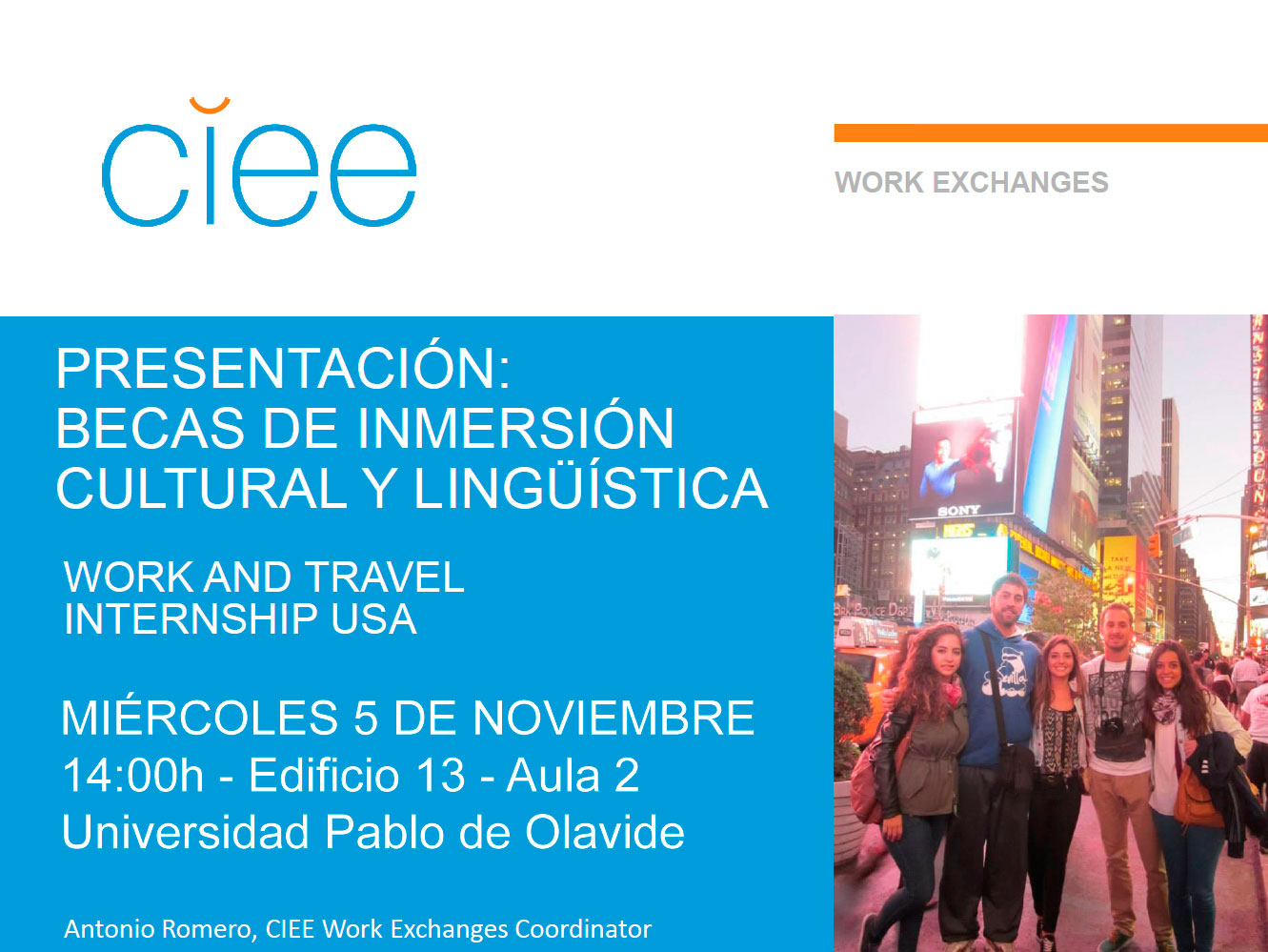 Hoy miércoles, a las 14 horas en el aula 2 del edificio 13 de la Universidad Pablo de Olavide, Antonio Romero, coordinador de intercambios del Council on International Educational Exchange (CIEE) presentará las Becas de Inmersión Cultural y Lingüística ‘Work and Travel. Internship USA’, dirigidas a estudiantes universitarios que deseen realizar prácticas remuneradas en Estados Unidos.