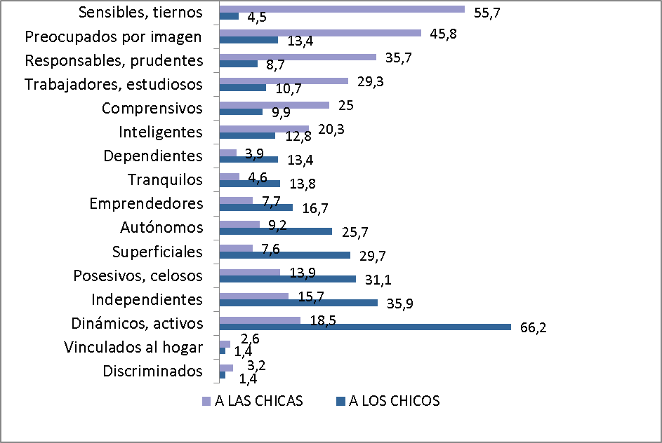 Uno de los principales objetivos del estudio es conocer las cualidades que se atribuyen a “ser chico” o “ser chica” y cómo se definen estas identidades. En este sentido, existe una aceptación muy generalizada entre chicos y chicas respecto a todos los tópicos que definen las hipotéticas diferencias: muy mayoritariamente las chicas son definidas como sensibles y tiernas (según el 56% de los jóvenes), preocupadas por la imagen (46%) y responsables y prudentes (36%). Los chicos, por su parte, como dinámicos y activos (66%), independientes (36%), y posesivos y celosos (31%).