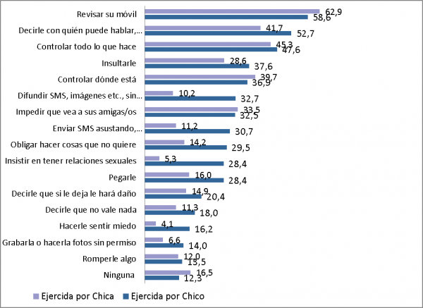 Son mayoritarios los actos relativos al control (revisión del móvil, con quién se puede hablar, dónde se puede ir…). Es la faceta en la que las chicas aparecen como protagonistas del acto con más frecuencia. Entre los chicos, son más habituales la intimidación, el control personal y emocional, la violencia física y verbal o la violación de la intimidad.