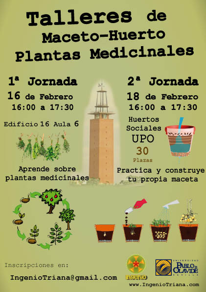 El segundo taller de maceto-huerto de plantas medicinales tendrá lugar en los huertos sociales de la UPO el jueves 18 de febrero a las 16:00 horas, y consistirá en una sesión práctica donde se explicará cómo preparar una maceta así como los diferentes tipos de abonos, sustratos, riego o drenaje. Al finalizar esta jornada todos los participantes se llevarán consigo su maceta preparada, con uno de los ejemplares de plantas medicinales expuestos en la sesión anterior, tales como Stevia, Kalanchoe, Boldo de la India, Vaporub o Ginseng de 5 hojas.