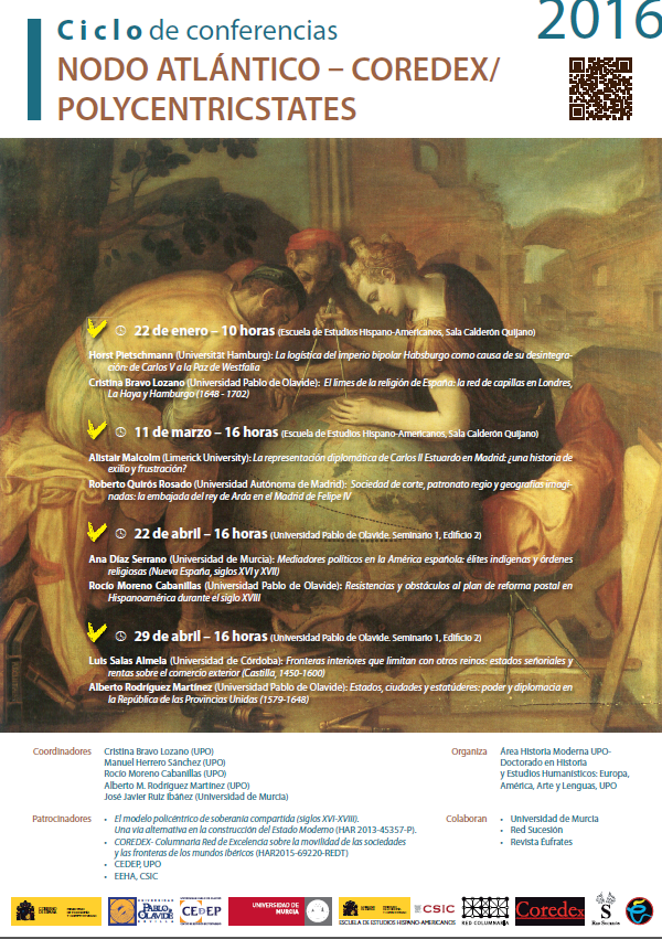 CapturaHoy viernes 22 de abril, a las 16 horas en la en el seminario 1 del edificio 2 de la Universidad Pablo de Olavide  tendrá lugar la tercera sesión del ciclo de conferencias “Nodo Atlántico-Coredex/Polycentricstates” organizado por el Área de Historia Moderna de la UPO con la colaboración de Universidad de Murcia y la Escuela de Estudios Hispano-Americanos. El ciclo tiene como objetivo discutir sobre métodos y nuevas líneas de investigación en el ámbito de la Historia Moderna desde una perspectiva interdisciplinar.