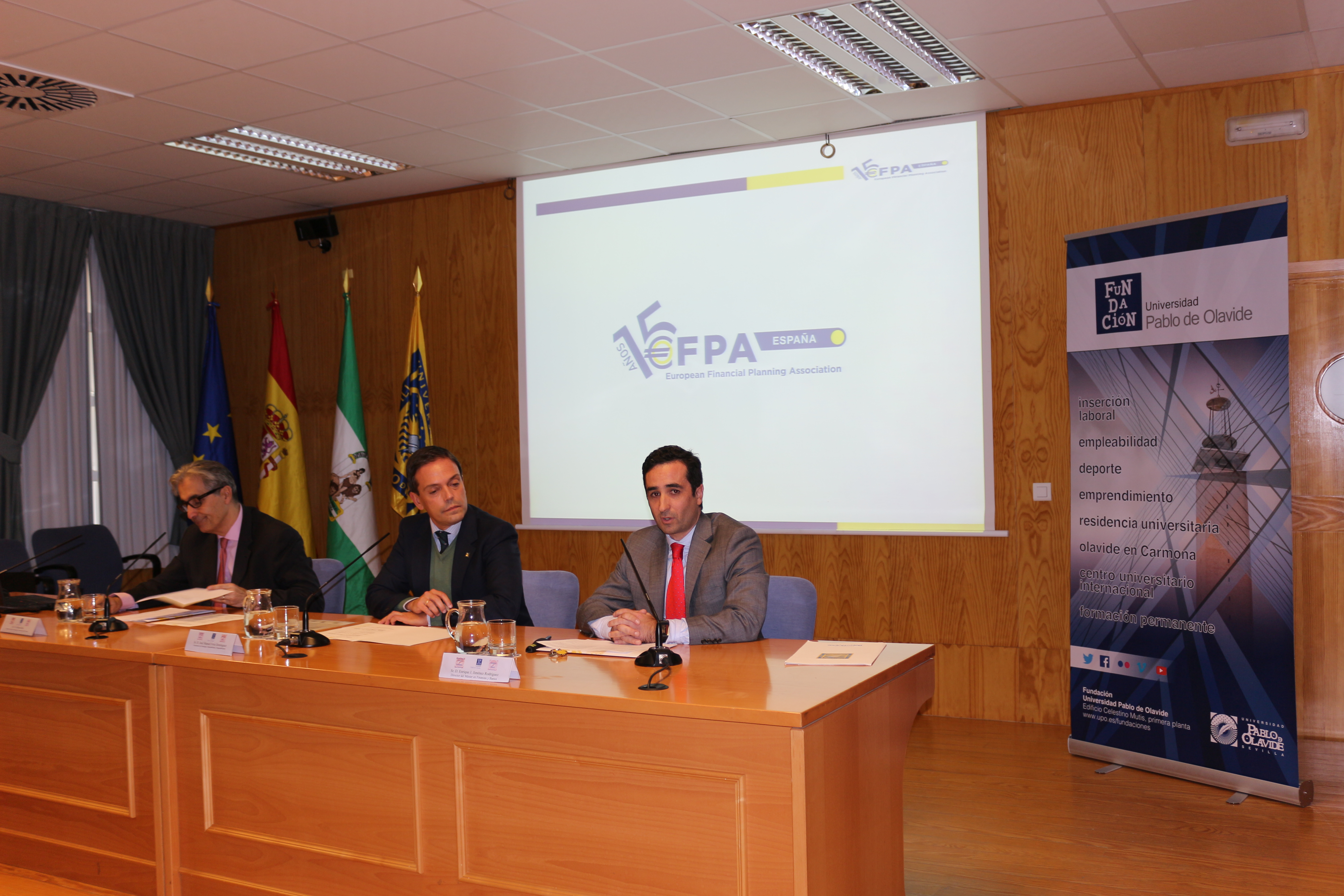 La Universidad Pablo de Olavide acoge la primera Jornada de Asesoramiento Financiero y Patrimonial, un evento enmarcado en el Máster Universitario de Finanzas y Banca. El acto de inauguración estuvo presidido por el vicerrector de Estrategia, Empleabilidad y Emprendimiento de la UPO, José Manuel Feria; el presidente del Comité de Acreditación y Certificación de EFPA España, Alfonso Roa y el director del Máster en Finanzas y Banca, Enrique Jiménez.