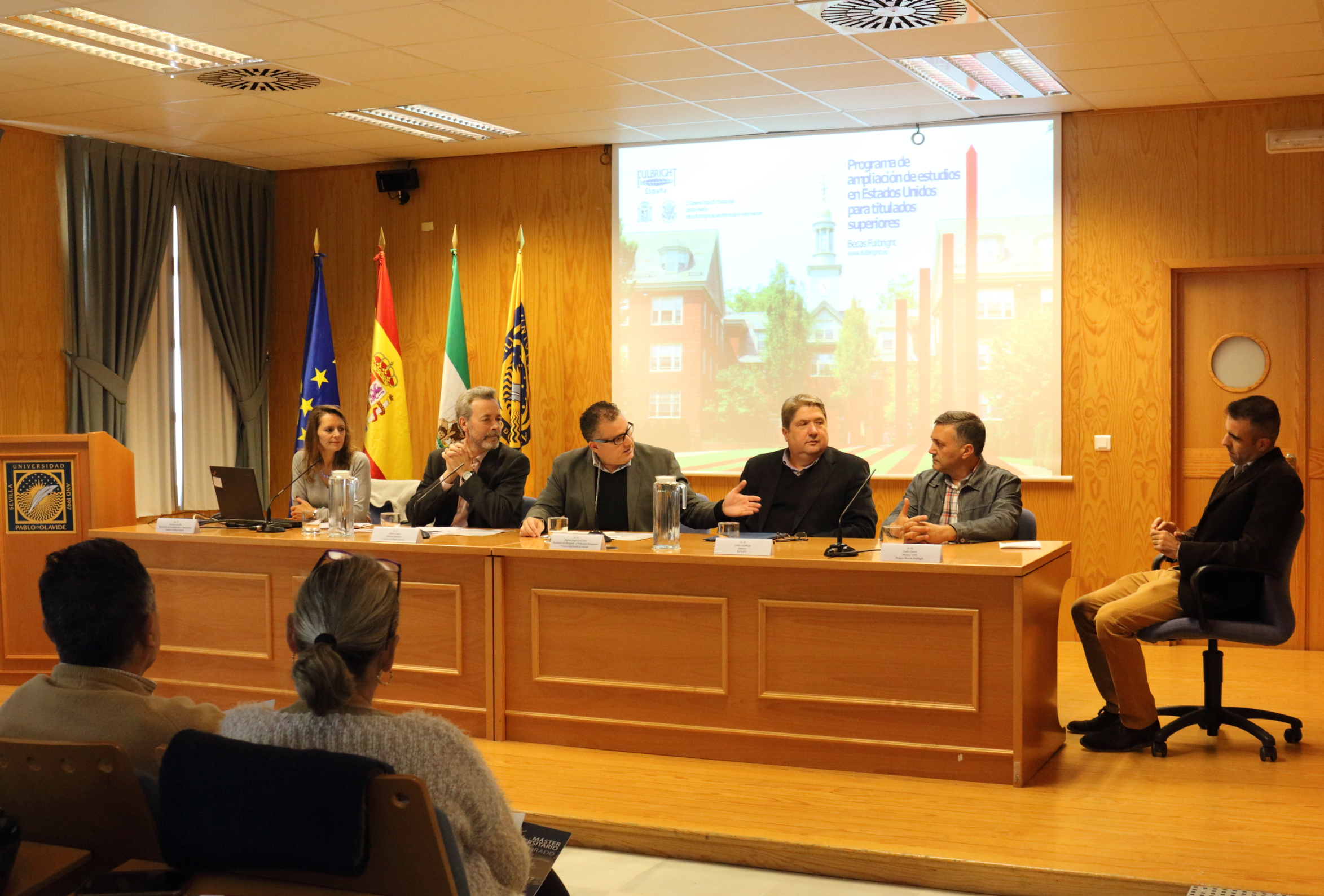 Este mediodía en la Universidad Pablo de Olavide se ha celebrado una sesión informativa sobre las becas Fulbright. El acto ha estado presidido por el vicerrector de Postgrado y Formación Permanente de la UPO, Miguel A. Gual acompañado por el director ejecutivo de la Comisión Fulbright-España, Alberto López, el responsable de Documentación y Comunicación de la Comisión Fulbright-España, Patricia de la Hoz, el director de la EDUPO, Carlos Usabiaga, y el profesor de la UPO y antiguo becario Fulbright, Carlos Santos Ocaña.
