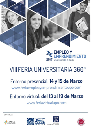 VIII-Feria-Empleo-UPOHoy martes 7 de marzo, a las 11.00 horas, en la sede de la Casa de la Provincia de Sevilla (Plaza del Triunfo, 1), el rector de la Universidad Pablo de Olavide, Vicente Guzmán Fluja, presidirá el acto de presentación de la VIII edición de la Feria Universitaria 360º, un encuentro para fomentar el empleo y el emprendimiento entre los jóvenes universitarios y que aúna el formato presencial y el virtual.