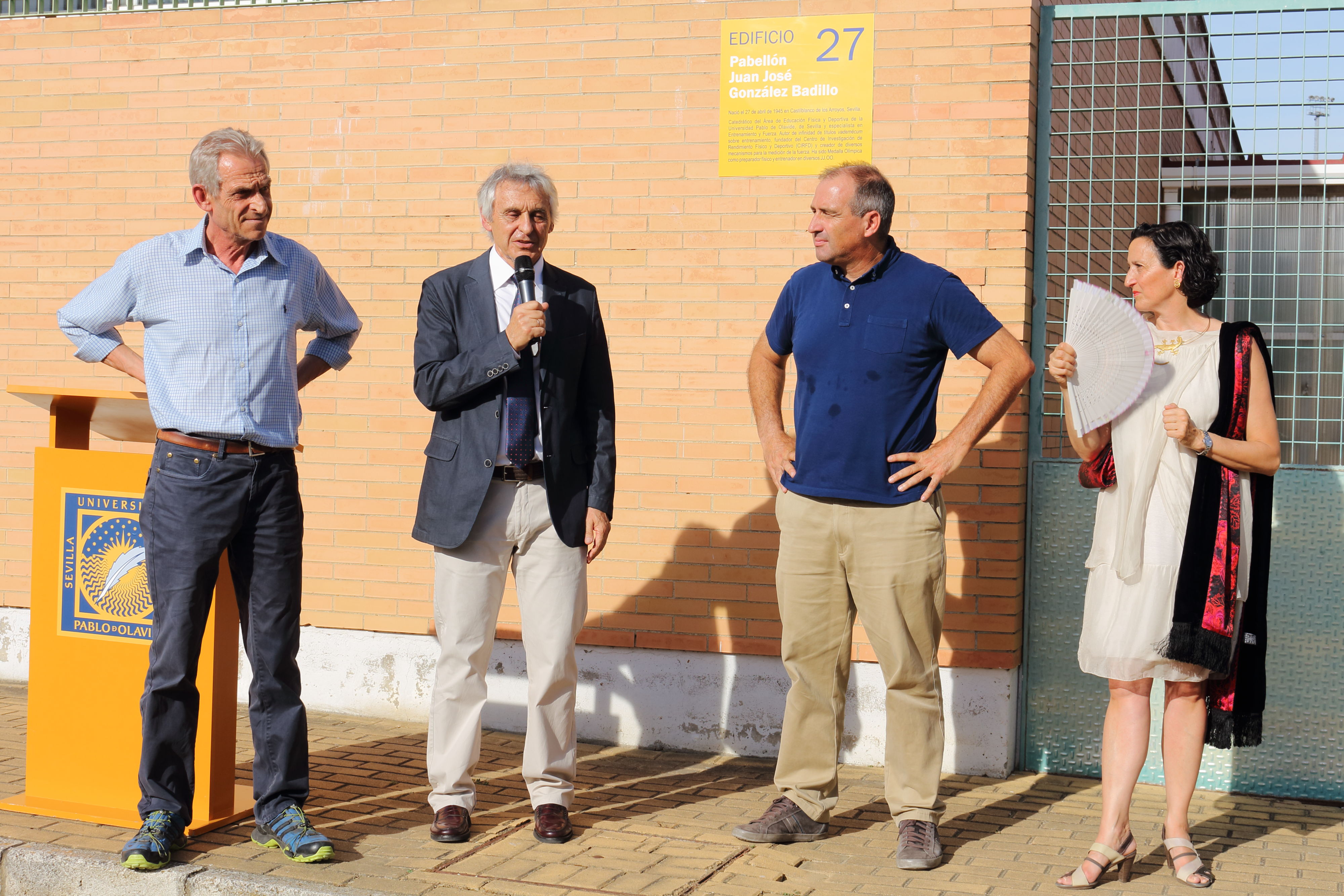 El vicerrector de Investigación y Transferencia de Tecnología de la Universidad Pablo de Olavide, Bruno Martínez Haya, ha presidido el acto en el que se ha homenajeado al profesor Juan José González Badillo, catedrático de Teoría y Práctica del Entrenamiento Deportivo y ex decano de la Facultad de Ciencias del Deporte de esta universidad. En el acto, que ha tenido lugar hoy viernes 9 de junio y al que han asistido también la decana de la Facultad de Ciencias del Deporte, África Calvo Lluch, y el catedrático de Botánica Modesto Luceño, se ha descubierto una placa en honor del profesor en el Centro de Alto Rendimiento Deportivo del campus de la UPO.