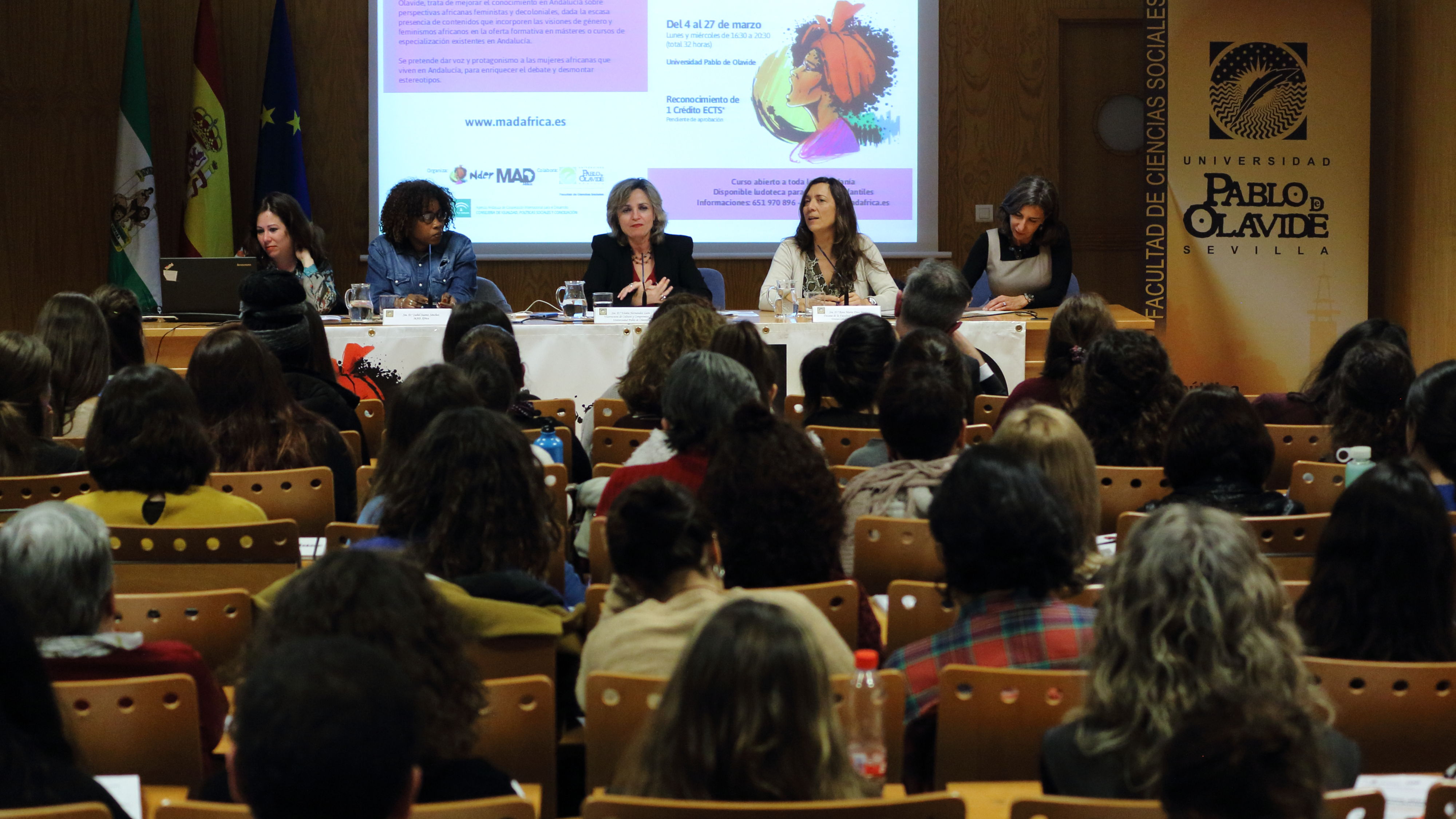 El  lunes también tuvo lugar la primera jornada del curso ‘Feminismos Africanos y Decolonialidad’, inaugurada por Elodia Hernández León, vicerrectora de Cultura y Compromiso Social de la UPO, acompañada por Isabel Suarez Sánchez, de MAD África, y Rosa Díaz Jiménez, decana de la Facultad de Ciencias Sociales de la UPO. Este curso, organizado por MAD África, África con Voz Propia y la Facultad de Ciencias Sociales, se desarrollará hasta el 27 de marzo.