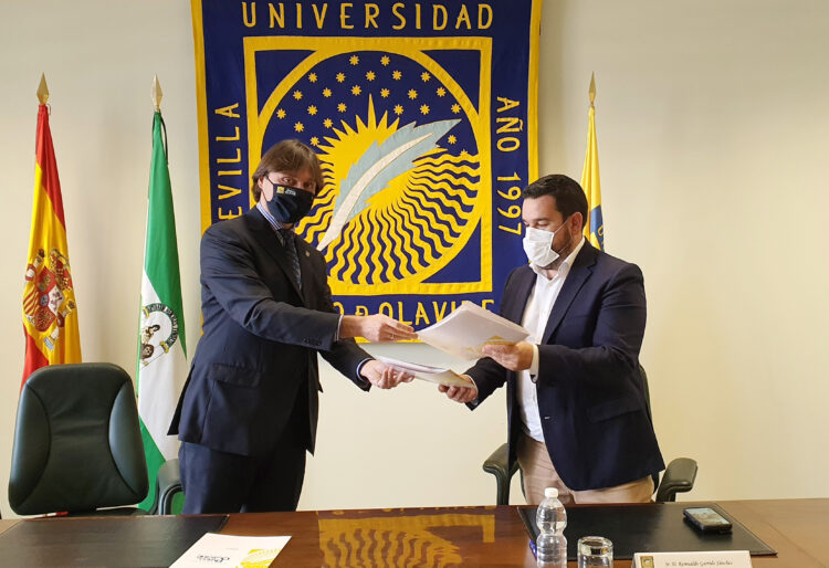 El rector de la Universidad Pablo de Olavide, Francisco Oliva Blázquez, y el alcalde del Ayuntamiento de Gines, Romualdo Garrido Sánchez, han firmado en la mañana de hoy un convenio de colaboración a través del cual este municipio sevillano renueva su compromiso con el Aula Abierta de Mayores de la UPO.