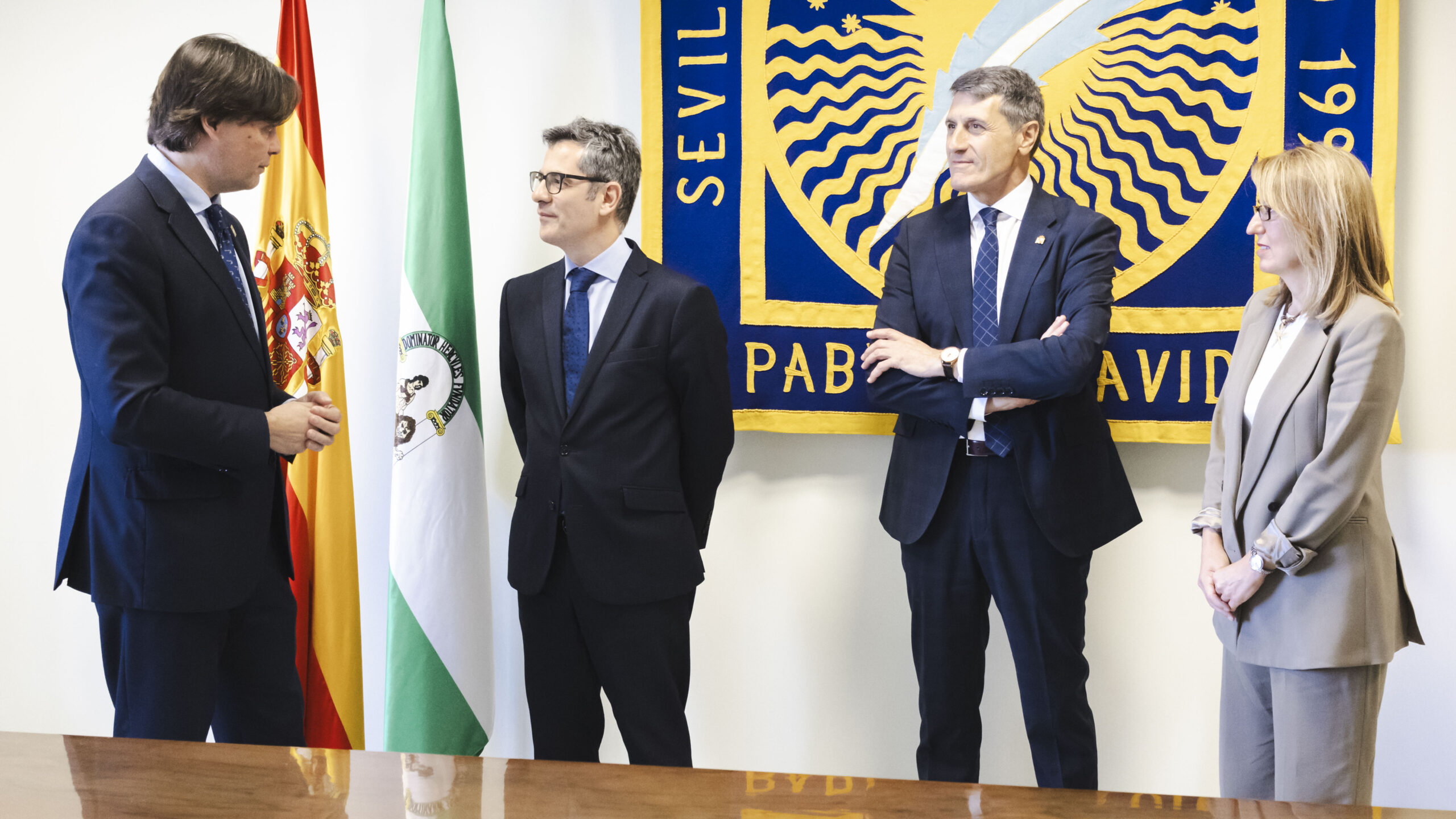 La nueva sede del Instituto Nacional de Toxicología y Ciencias Forenses (INTCF), que sustituirá las instalaciones de la Avda. Doctor Fedriani en Sevilla, ocupará una parcela de 6.460 metros cuadrados situada en la calle Miguel de Múzquiz del campus. El ministro de la Presidencia, Justicia y Relaciones con las Cortes, Félix Bolaños, ha visitado hoy la Universidad Pablo de Olavide y se ha reunido con el rector, Francisco Oliva, quien le ha informado de las nuevas posibilidades que tendrá el INTCF gracias a estar ubicado en el campus de la Olavide. El delegado del Gobierno en Andalucía, Pedro Fernández, y la vicerrectora de Relaciones Institucionales y Fundaciones de la UPO, Laura López de la Cruz han estado también presentes durante la visita.