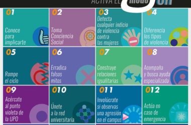 Con el objetivo de lanzar un mensaje de implicación conjunta y dar a conocer actuaciones y recursos para la concienciación, sensibilización, prevención y participación, atención, formación y especialización contra las violencias de género, la Universidad Pablo de Olavide publica la nueva guía digital ‘Activa el modo on: 016 pasos contra la violencia de género’, editada por el Vicerrectorado de Cultura y Compromiso Social y en el marco de las actuaciones financiadas con cargo al Pacto de Estado contra la Violencia de Género del Ministerio de Igualdad.