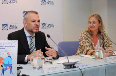 El ‘Manual de Actuación en Materia de Voluntariado Universitario en Andalucía’ ha sido presentado esta mañana en la Universidad Pablo de Olavide. Elaborado por la UPO a través del Observatorio Andaluz de Voluntariado Universitario, con la participación de todas las universidades públicas andaluzas, el Manual pretende ser una guía común para el impulso del voluntariado universitario. La presentación ha corrido a cargo de David Cobos, vicerrector de Cultura y Políticas Sociales de la Universidad, e Inmaculada de la Rosa, en representación de la Secretaría General de Familias, Igualdad, Violencia de Género y Diversidad de la Junta de Andalucía.
