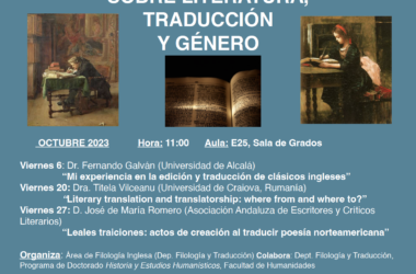 El Área de Filología Inglesa de la Universidad Pablo de Olavide ha organizado las IV Jornadas Internacionales sobre Literatura, Traducción y Género que se celebrarán en la Sala de Grados de la Biblioteca/CRAI los días 6, 20 y 27 de octubre con la coordinación de las profesoras María Losada Friend y Vernónica Pacheco Costa y la colaboración del Departamento de Filología y Traducción, el Programa de Doctorado ‘Historia y Estudios Humanísticos’ y la Facultad de Humanidades de la UPO. Se entregará certificado de asistencia.
