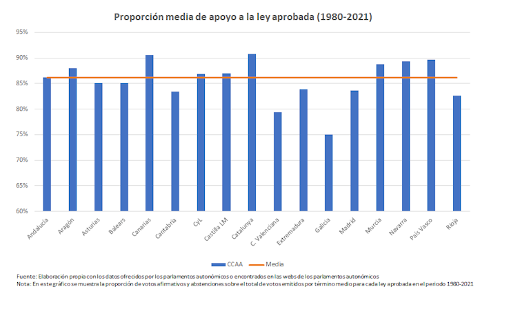 Un análisis detallado de la aprobación de las leyes en los parlamentos autonómicos permite señalar que el grado de acuerdo entre los grupos políticos es elevado puesto que las leyes suelen aprobarse por término medio con solo un 16 % de votos negativos.