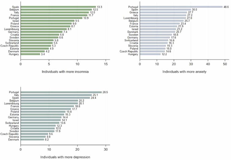 En segundo lugar, el cuestionario covid-19 de la Encuesta de Salud, Envejecimiento y Jubilación en Europa (SHARE) nos permitió identificar a los individuos que reportaron haber sufrido un empeoramiento de su salud mental tras la irrupción de la pandemia. Así constatamos que un 9,9 %, 23,1 % y 18,7 % de los individuos habían experimentado más problemas de insomnio, ansiedad y depresión, respectivamente. Observamos, además, que existe gran variabilidad entre países.