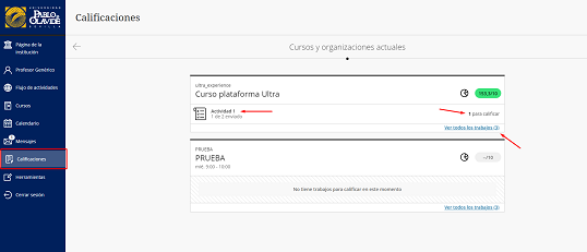 Se puede seleccionar un elemento para verlo en detalle o calificarlo, o el nombre de un curso para ir a la página de calificaciones general correspondiente.