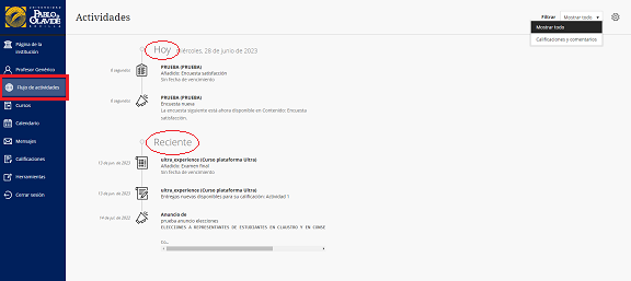 Flujo de actividades: vea las últimas actividades realizadas en sus cursos.