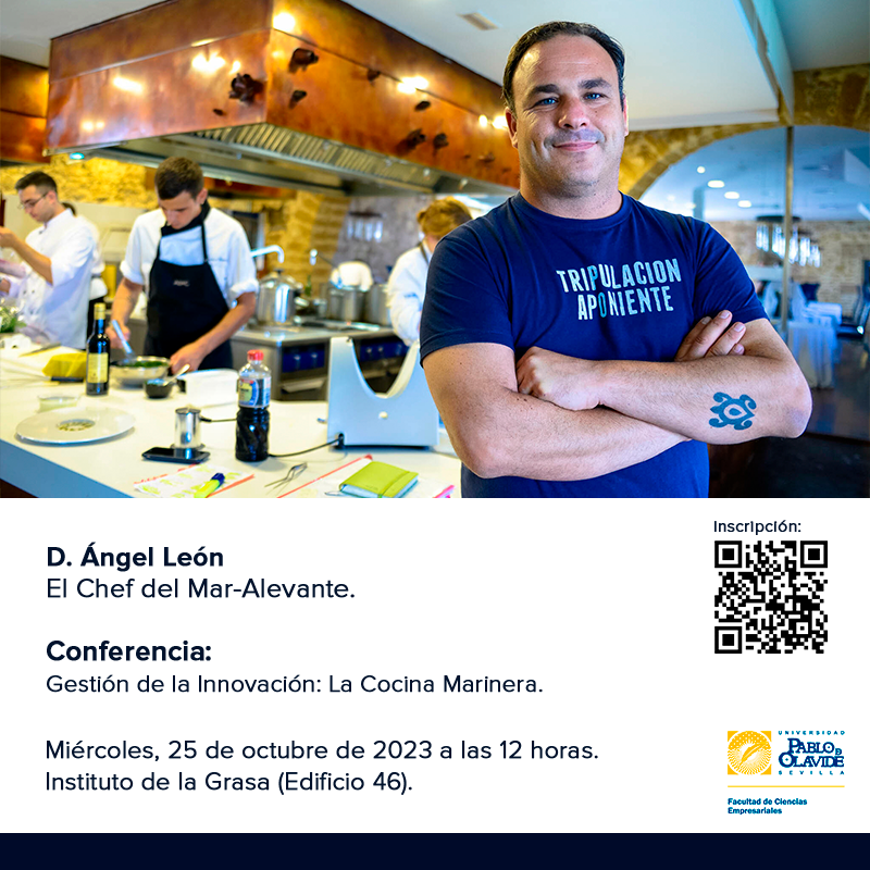 El próximo 25 de octubre a las 12:00 horas, el Chef del Mar-Alevante, D. Ángel León, impartirá la charla "Gestión de la Innovación: La Cocina Marinera del Siglo XXI". Dicho acto se celebrará en el salón de actos del Instituto de la Grasa (Edificio 46)