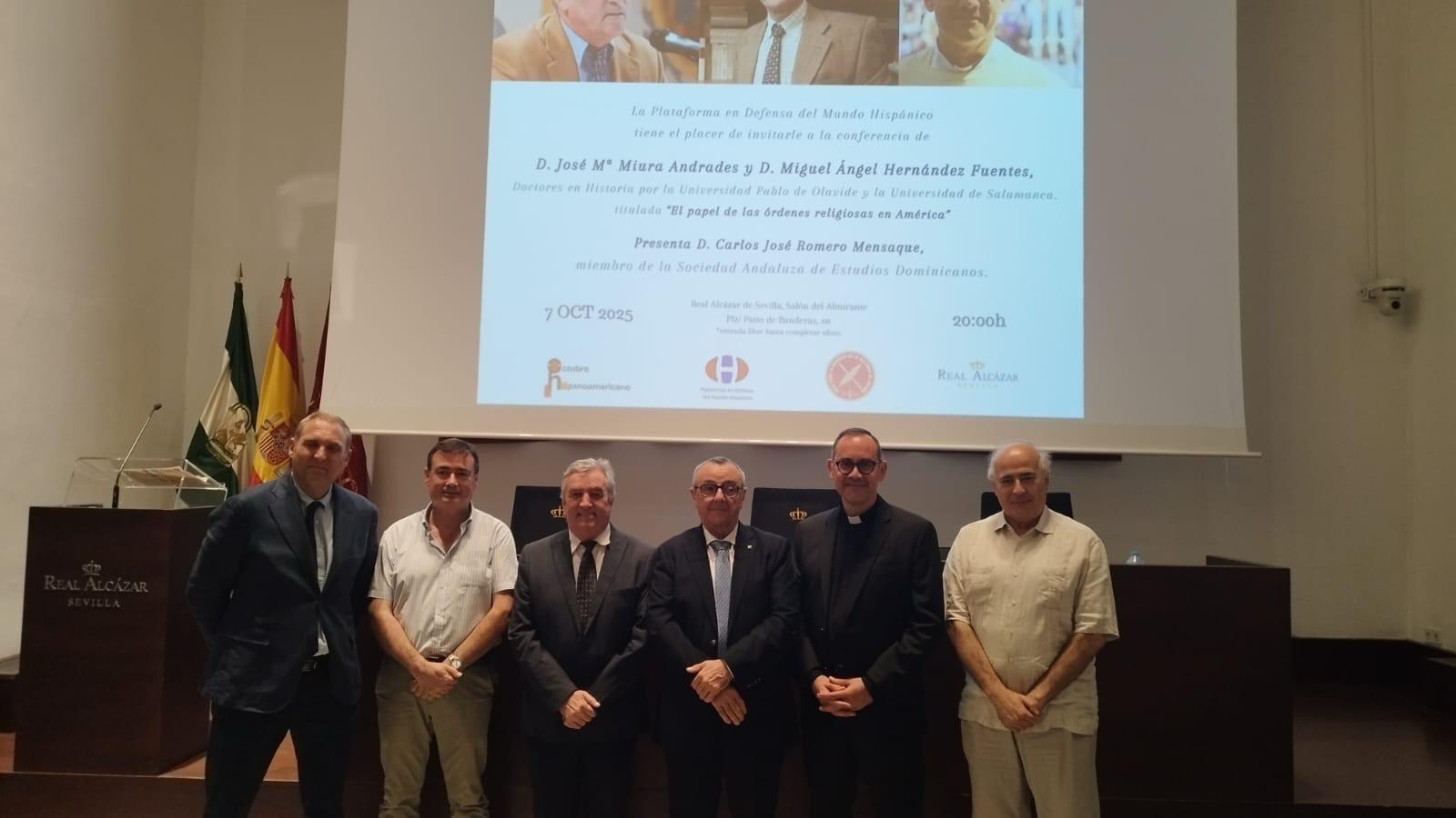 El pasado 7 de octubre, en el acto organizado por la Plataforma en Defensa del Mundo Hispánico, los profesores José María Miura (UPO) y Miguel Ángel Hernández Fuentes (USAL) impartieron la conferencia "El papel de las órdenes religiosas en América". El acto fue presentado por Carlos José Romero Mensaque (Sociedad Andaluza de Estudios Dominicanos) y tuvo lugar en el Alcázar de Sevilla.