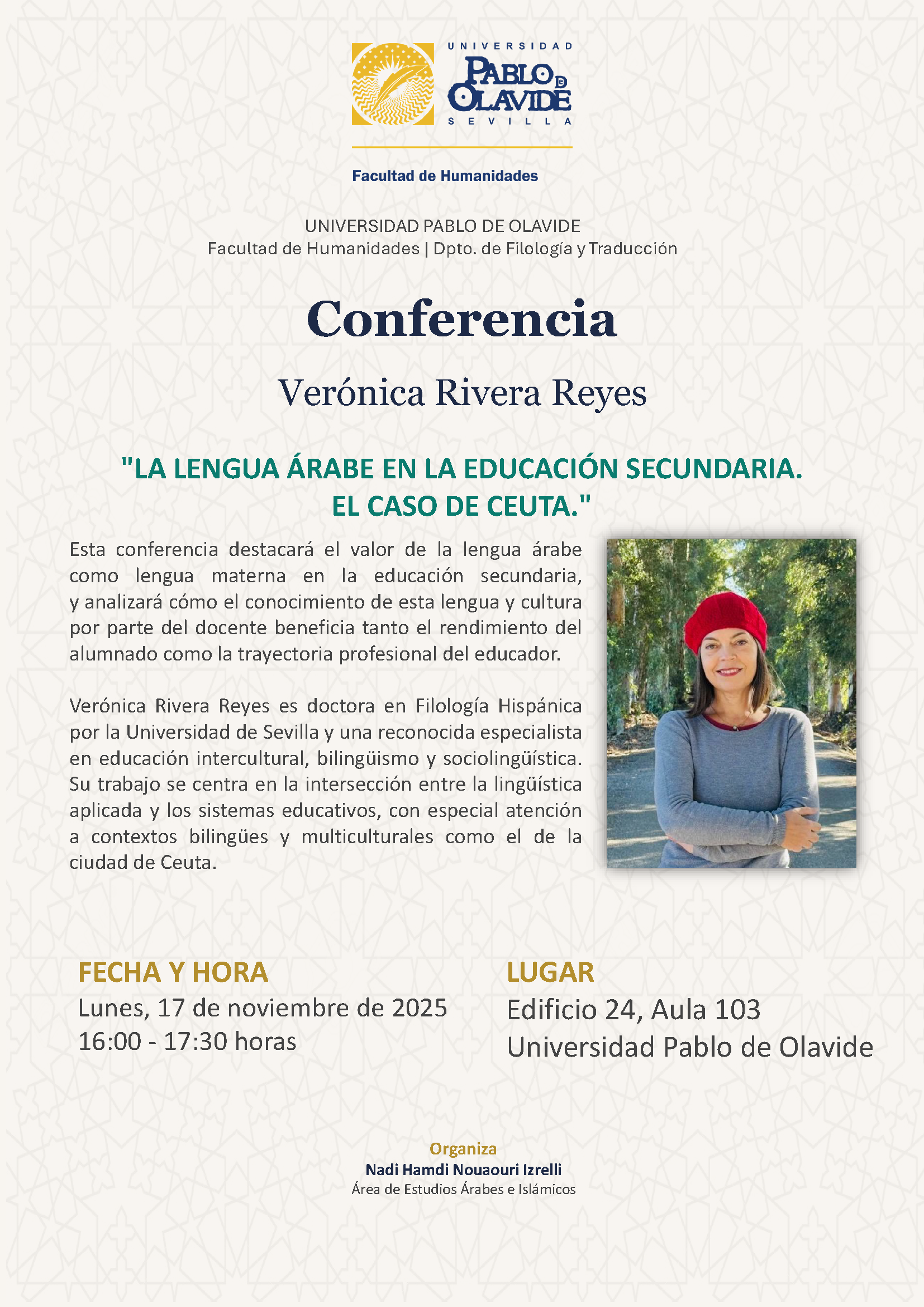 La Facultad de Humanidades acogerá el próximo lunes 17 de noviembre la conferencia titulada “La lengua árabe en la educación secundaria. El caso de Ceuta”, a cargo de la investigadora Verónica Rivera Reyes. El acto tendrá lugar en el Edificio 24, Aula 103, de 16:00 a 17:30 horas.