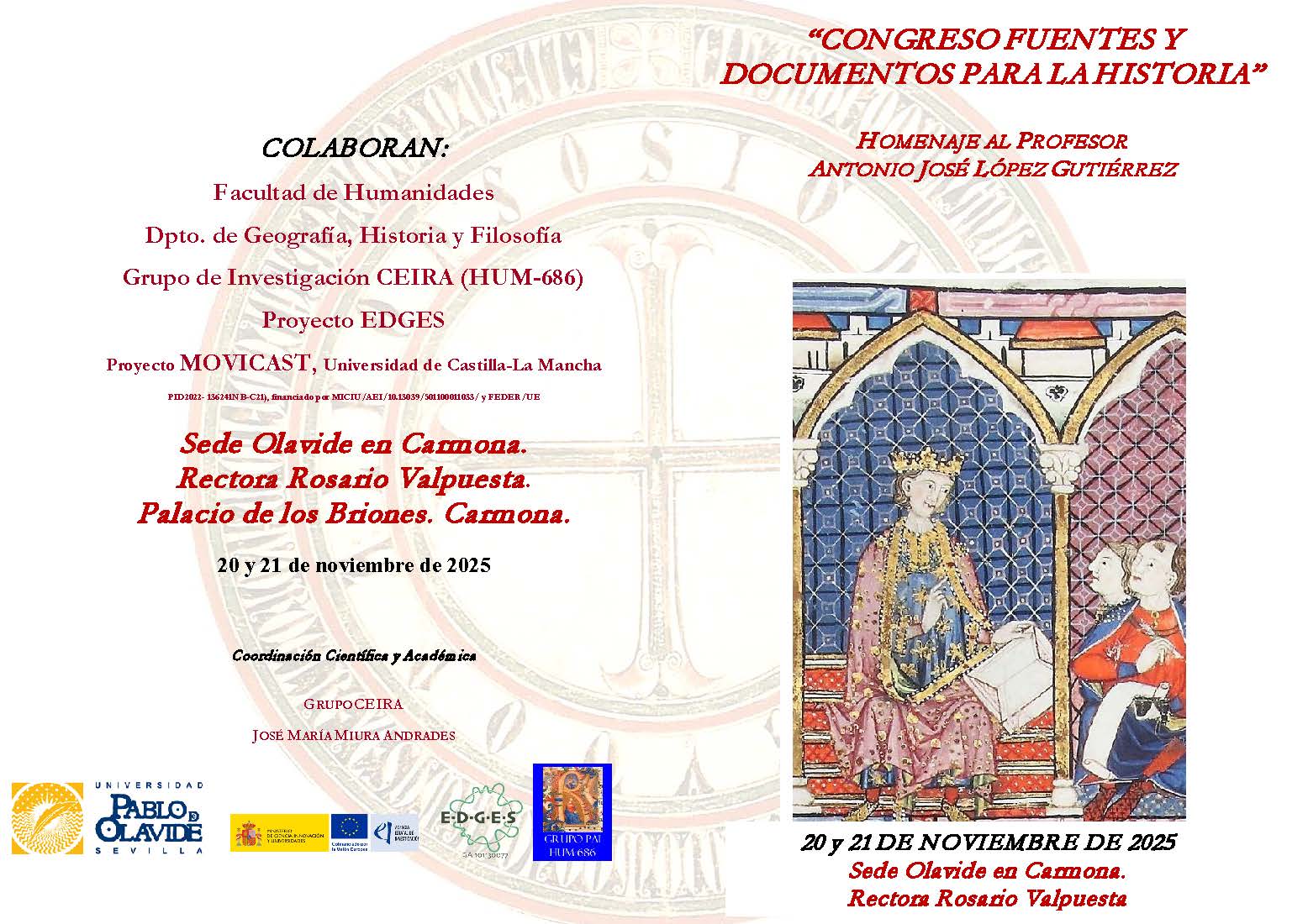 Organizado por el profesor José Mª Miura Andrades, los próximos días 20 y 21 de noviembre se celebrará el “CONGRESO FUENTES Y DOCUMENTOS PARA LA HISTORIA” HOMENAJE AL PROFESOR ANTONIO JOSÉ LÓPEZ GUTIÉRREZ, en la ciudad de Carmona. El profesor López Gutiérrez recibió el pasado mayo un merecido homenaje en su jubilación por parte de alumnos de Grado y egresados. Toca el turno ahora a un excelente elenco de profesores, investigadores y profesionales de la Archivística el ofrecer con un brillante programa nuestro agradecimiento por sus años de estudio y entrega al conocimiento y a nuestra Facultad de Humanidades. El congreso será clausurado por la Decana de la Facultad, María Losada Friend.