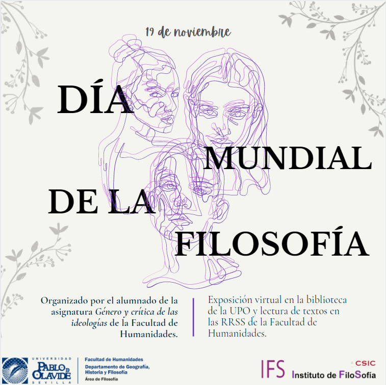 Con motivo del DÍA MUNDIAL DE LA FILOSOFÍA, y con el fin de dar a conocer a filósofas de distintas épocas y procedencias, el alumnado de "Género y crítica de las ideologías" va a compartir con la comunidad universitaria a través de las redes sociales de la Facultad de Humanidades textos de estas filósofas y presentará una exposición virtual de carteles en la Biblioteca de la UPO.