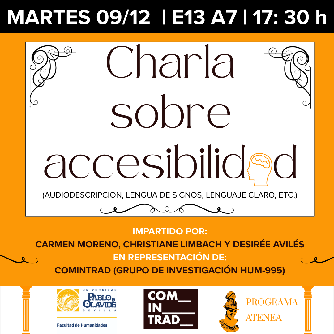 El martes 9 de diciembre, la Facultad de Humanidades celebra una actividad de especial interés para el alumnado de primero: una charla introductoria al campo de la accesibilidad cognitiva, con especial atención a ámbitos como la audiodescripción, la lengua de signos española (LSE), el lenguaje claro y otras modalidades de comunicación accesible.