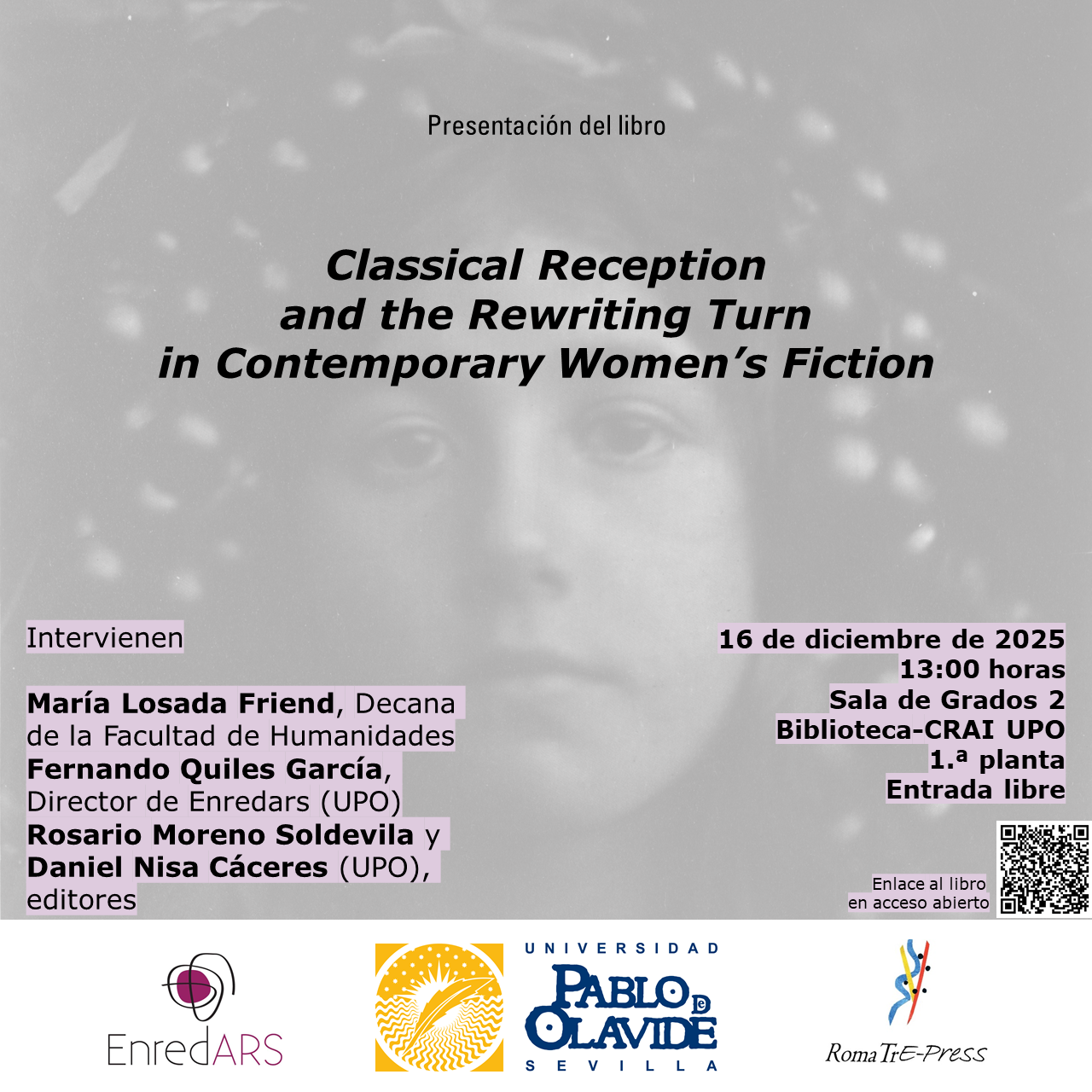 El próximo martes 16 de diciembre a las 13:00 horas se presenta el libro 'Classical Reception and the Rewriting Turn in Contemporary Women's Fiction', publicado por Enredars (UPO) y Roma Tre-Press. Editado por Rosario Moreno Soldevila y Daniel Nisa Cáceres, profesores del Departamento de Filología y Traducción de la UPO, este volumen colectivo aúna diversos estudios sobre la reescritura de narrativas mitológicas grecolatinas en la ficción contemporánea escrita por mujeres en lengua inglesa.