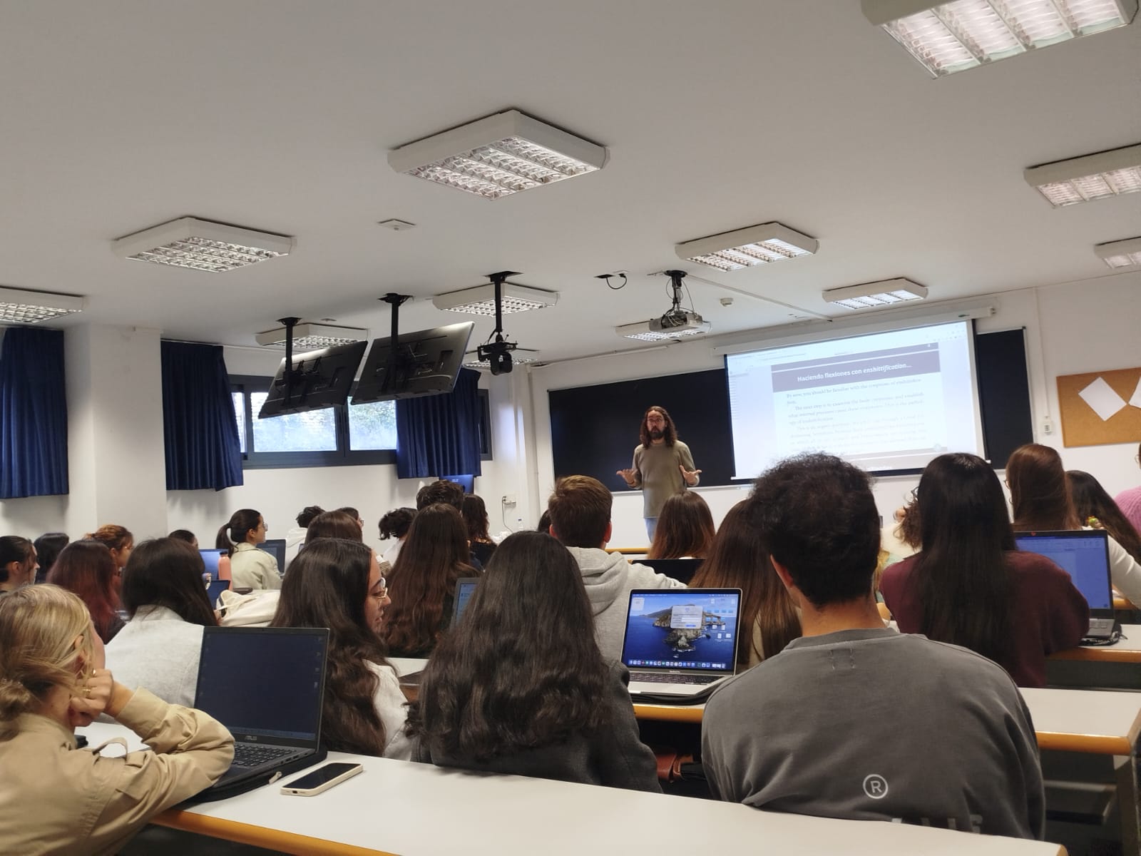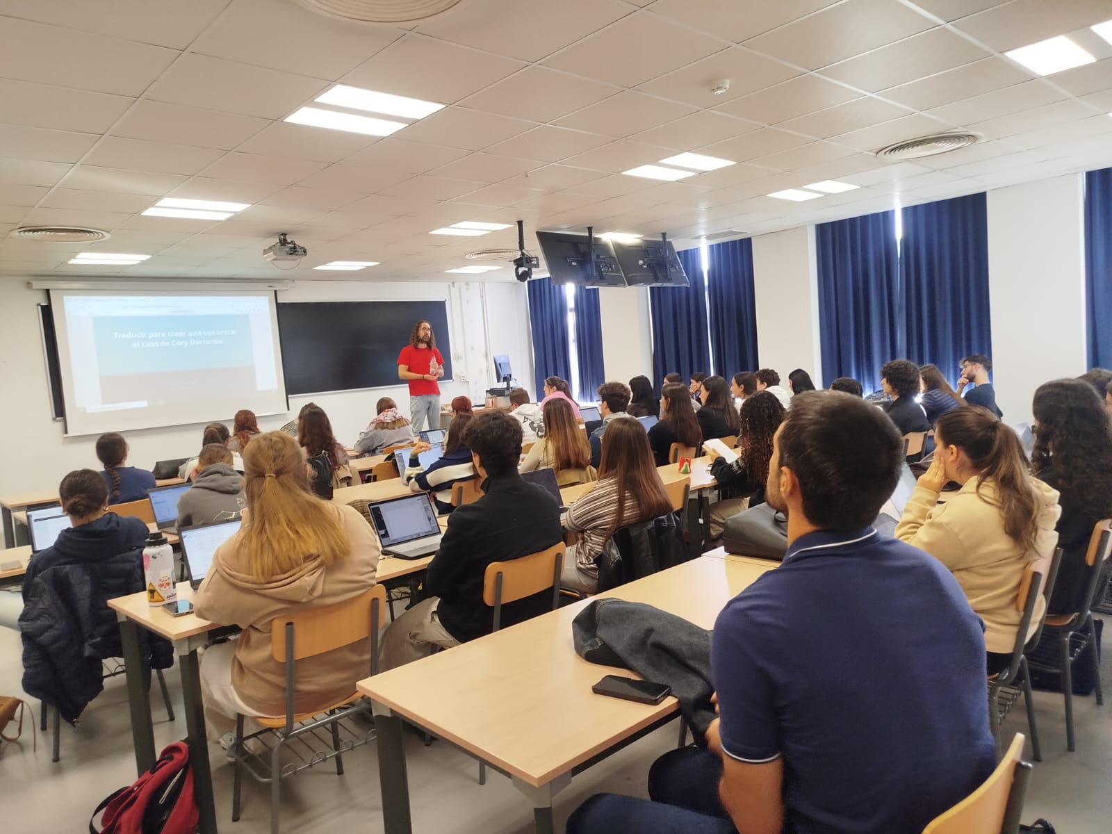 El pasado lunes 10 de noviembre, organizado por las profesoras Cristina Ramírez y Elisa Calvo, tuvo lugar el "Seminario Práctico "Traducir para crear una voz única: el caso de Cory Doctorow en español", impartido por el traductor literario Enrique Maldonado Roldán. Ha traducido más de 50 libros entre los que se incluyen las obras de Doctorow al español para la editorial Capitán Swing, y autores como Iris Murdoch, Washington Irving, Starobinets, Kipling o Stevenson. Maldonado analizó la importancia del tono y el estilo en la obra de Cory Doctorow, como reto de traducción. Doctorow, es un escritor y periodista canadiense especializado en el impacto social de la tecnología, cuya voz ágil y mordaz está marcada por un tono muy característico. De mano de los análisis "doctorowianos" sobre el impacto social de la IA, se generó un interesante debate sobre la automatización en contextos de traducción literaria y humanística. ¿Cómo reacciona la IA cuando los datos no construyen el sentido necesario, en contextos donde pesa más "lo que queda entre líneas", la mordacidad, el humor, la crítica implícita, los juegos de palabras y el estilo? ¿Cómo se favorece la lectura como experiencia inmersiva a través de la voz de un autor?" El seminario, vinculado a un proyecto de innovación en marcha tuvo gran acogida entre el alumnado y se ofreció por duplicado en el día.