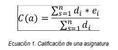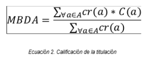 Así mismo, la calificación de la titulación viene determinada por la siguiente ecuación, si para cada asignatura su calificación ha sido mayor o igual a 5. Nótese que cr(a) hace mención al número de créditos asignados a la asignatura ‘a’: