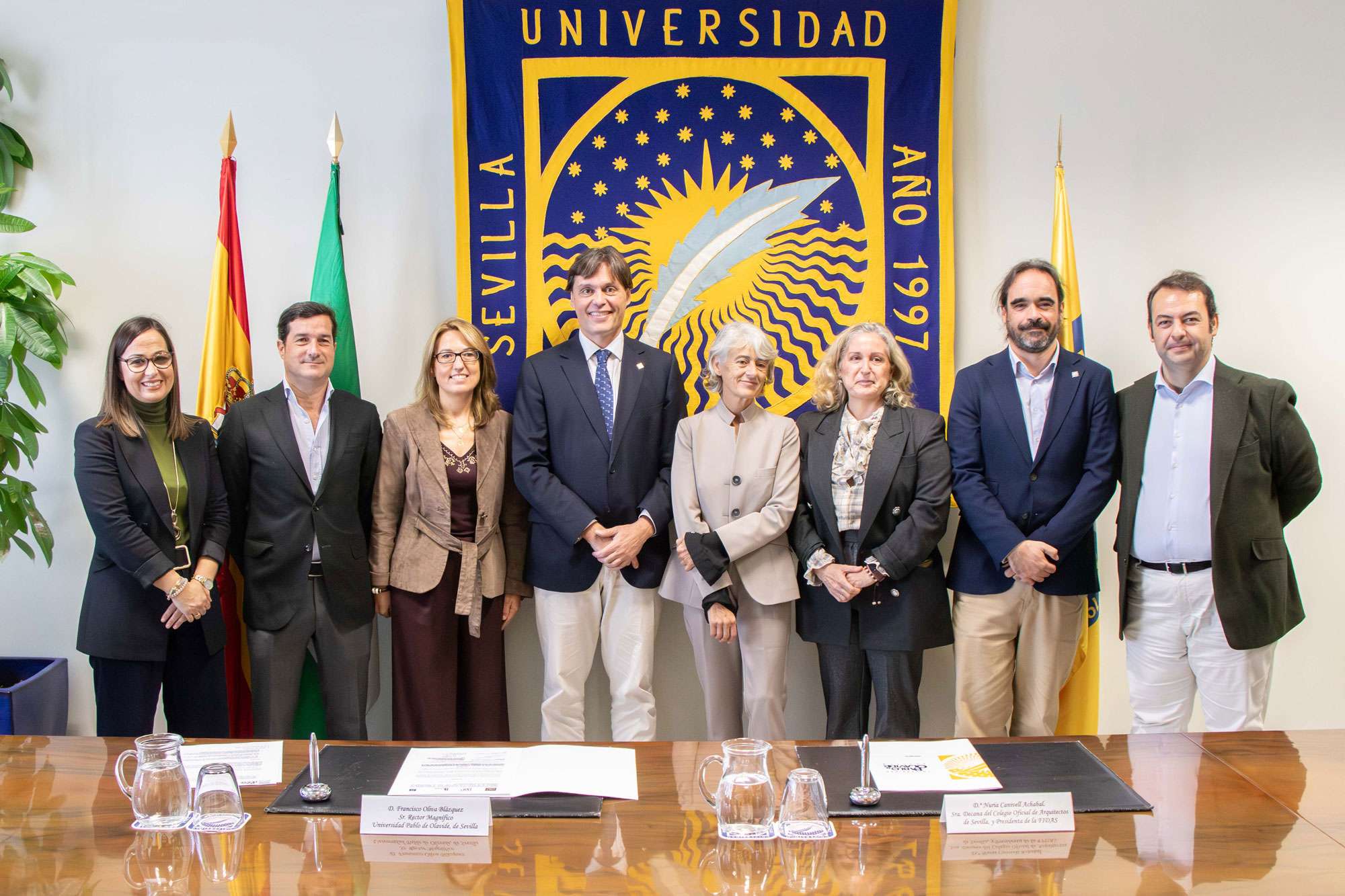 El acto de firma, a cargo del rector de la Universidad Pablo de Olavide, Francisco Oliva Blázquez, y de la decana del Colegio Oficial de Arquitectos de Sevilla y presidenta de FIDAS, Nuria Canivell Achabal, ha contado también con la presencia de la vicerrectora de Relaciones Institucionales, Formación Permanente y Fundaciones, Laura López de la Cruz; del director-gerente de la Fundación FIDAS, Alejandro Durendes Muñoz; del director de la Escuela Politécnica Superior de la UPO, Luis Merino Cabañas y de la directora de Comunicación y Estrategia de la Fundación Universidad Pablo de Olavide, Lola Ortiz Herrera.