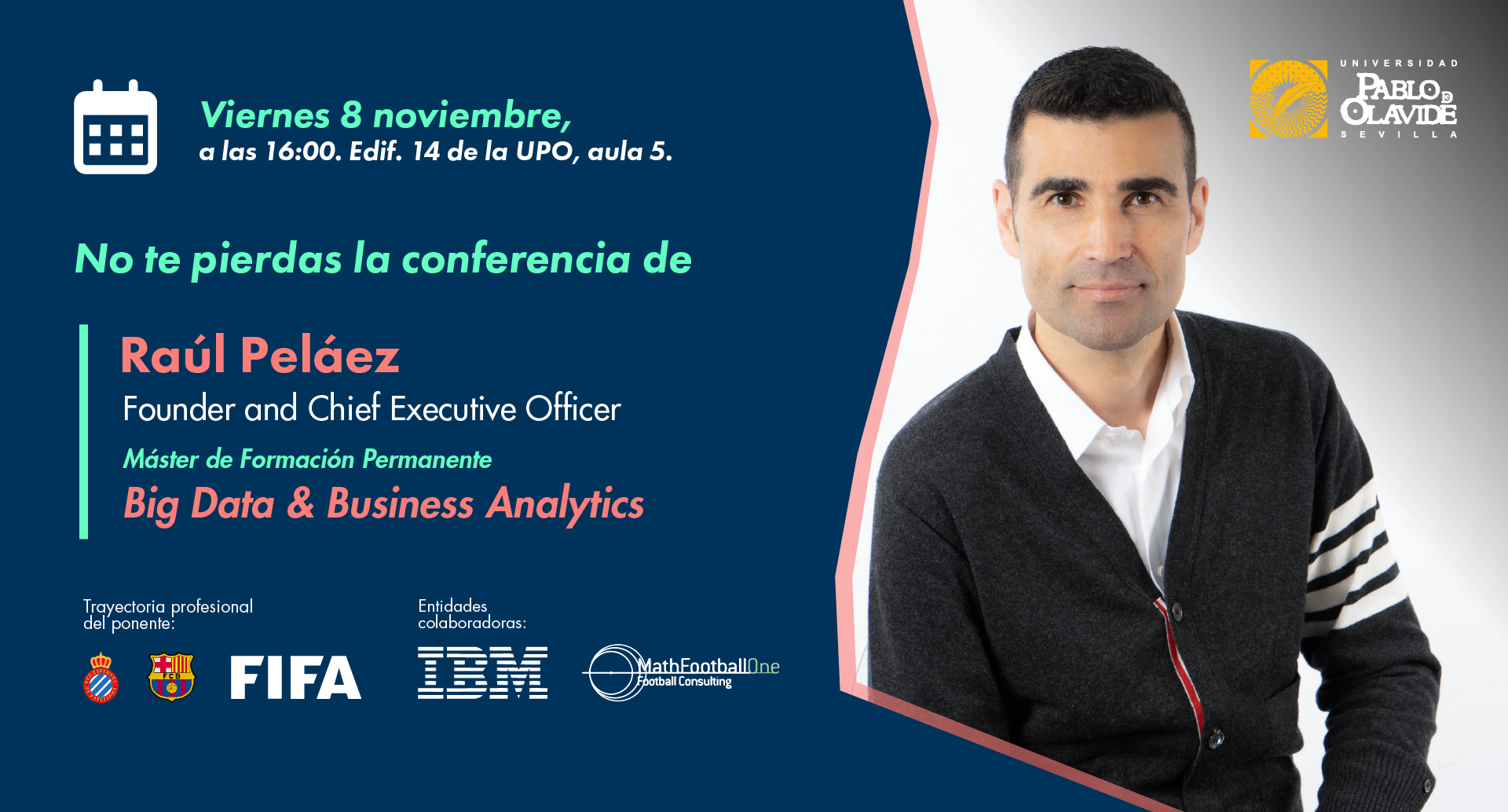 El Máster de Formación Permanente Big Data & Business Analytics, título propio de la Universidad Pablo de Olavide, acoge el próximo viernes la conferencia ‘Desencriptando el juego. Viaje a lo más profundo del fútbol a través del análisis avanzado de datos’, que impartirá Raúl Peláez, entrenador de fútbol UEFA A, fundador y CEO de Alite Sports SL y miembro del grupo de expertos en tecnología e innovación de FIFA como consultor externo.