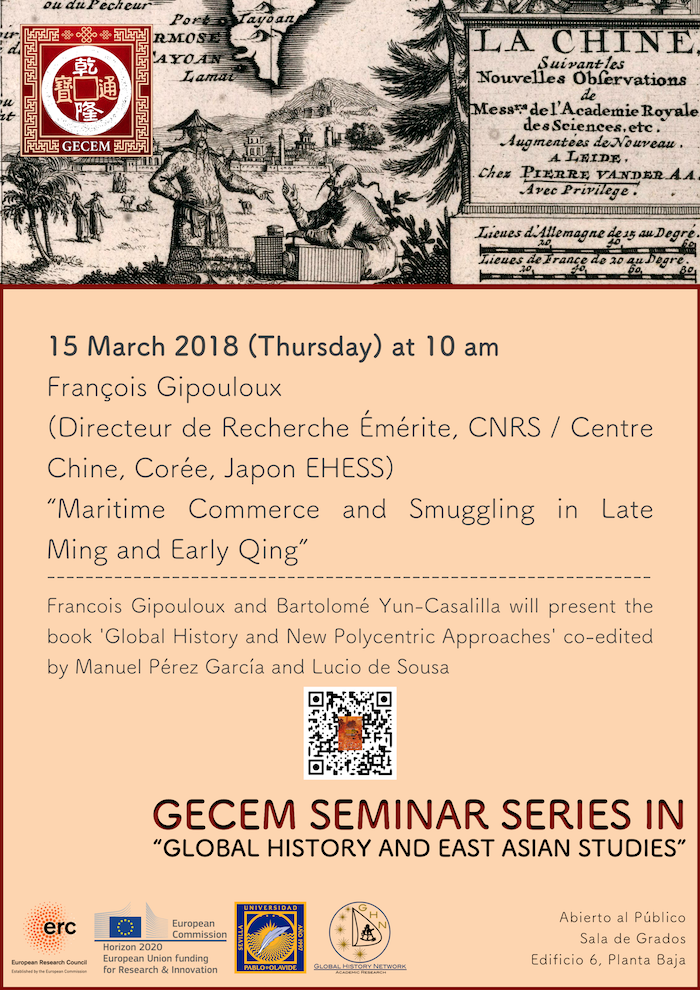 El 15 de marzo tendra lugar el GECEM Seminar Series in "Global History and East Asian Studies" con la conferencia del prof. François Gipouloux (Director de investigación emérito, CNRS / Centro de China, Corea, Japón EHESS) titulada 'Maritime Commerce and Smuggling in Late Ming and Early Qing'.