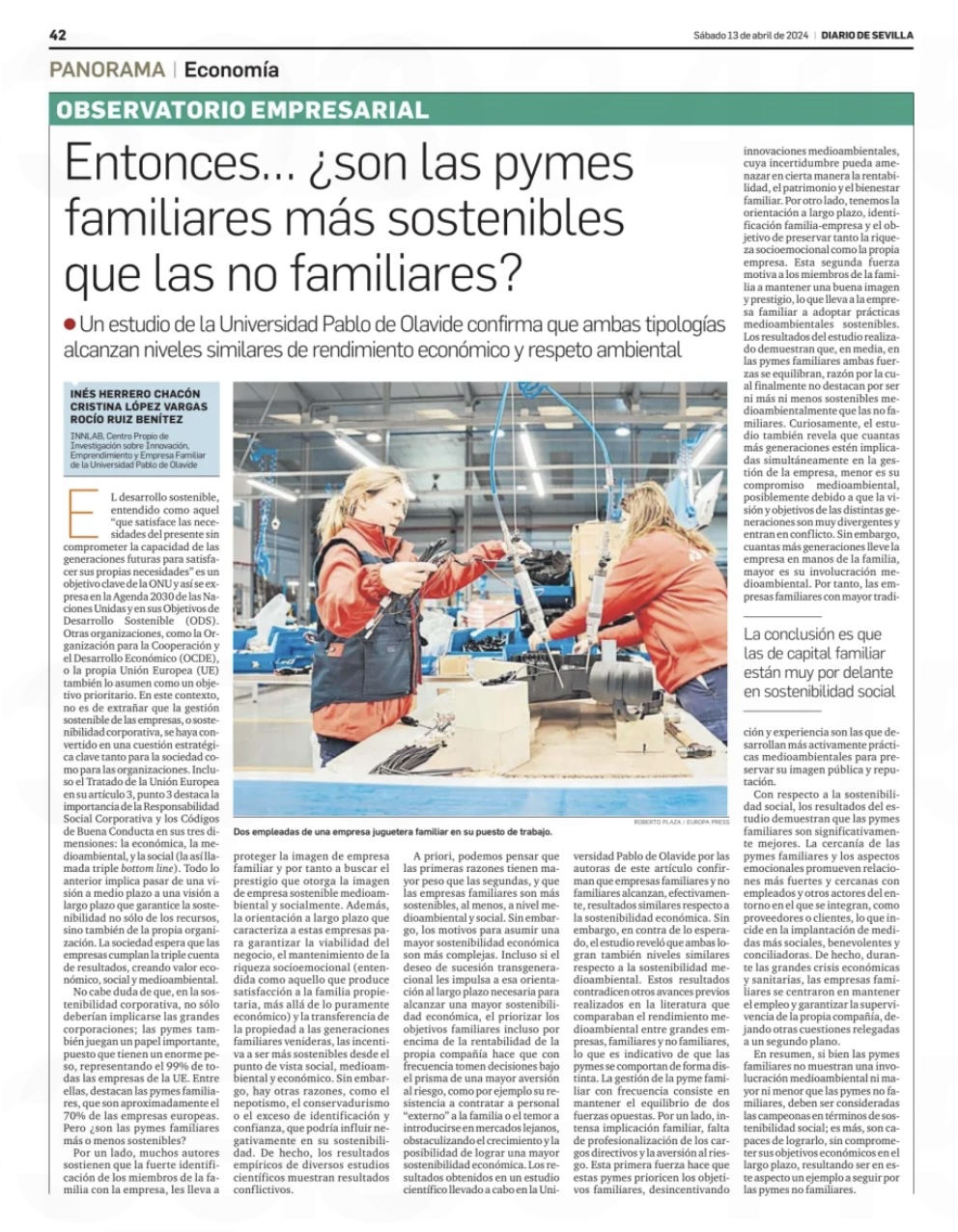 Medios 13 de abril de 2024 Entonces……¿son las pymes familiares más sostenibles que las no familiares? Un estudio de la Universidad Pablo de Olavide confirma que ambas topologías alcanzan niveles similares de rendimiento económico y respeto ambiental. Ir a artículo