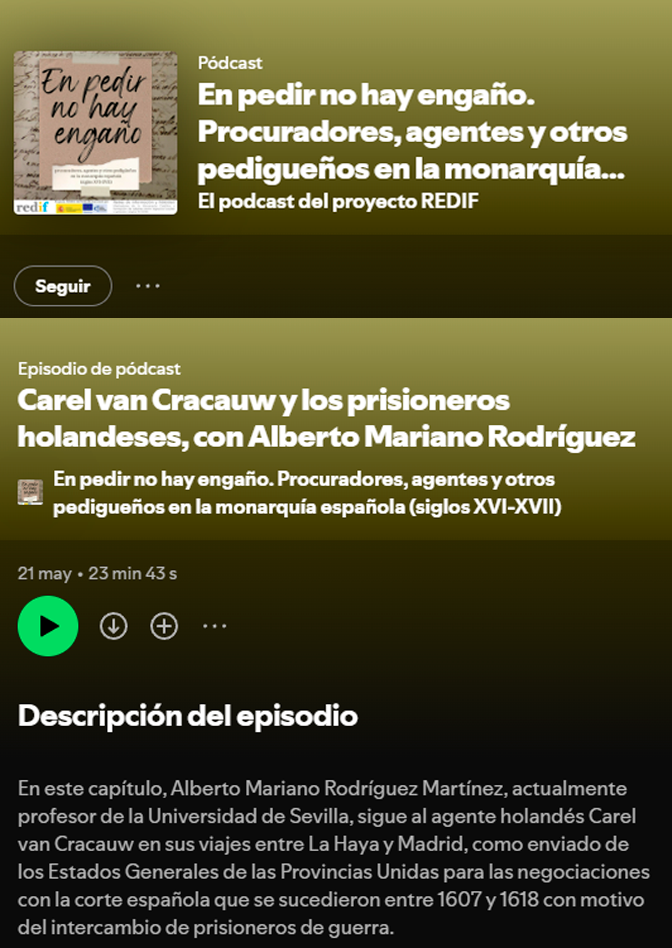 Episodio de pódcast: «Carel van Cracauw y los prisioneros holandeses», en En pedir no hay engaño. Procuradores, agentes y otros pedigueños en la monarquía española (siglos XVI-XVII).