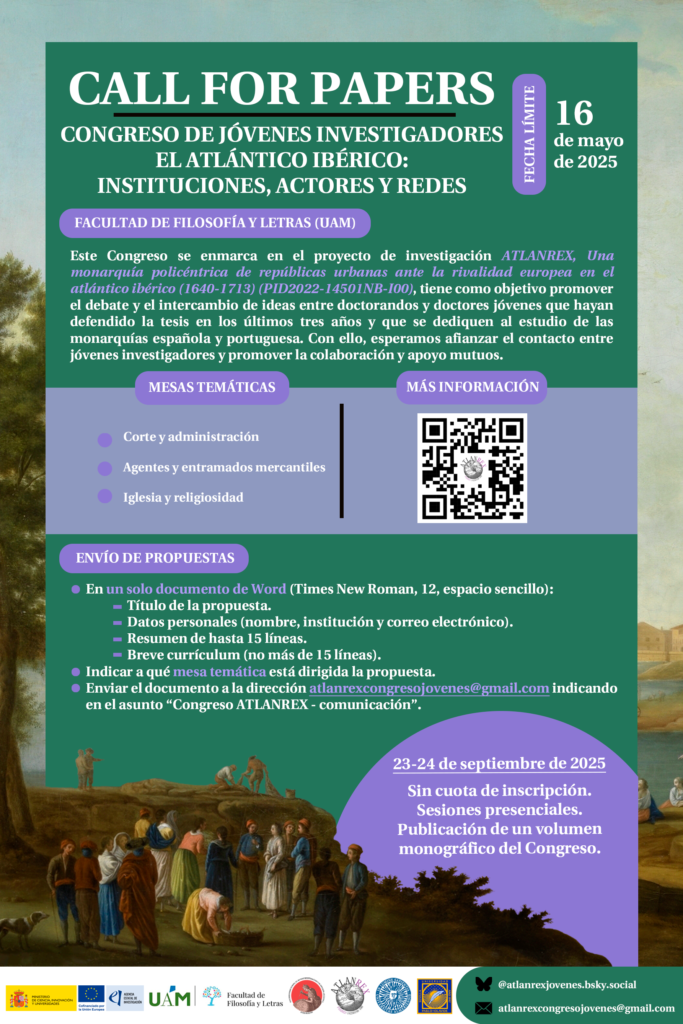 El grupo PAIDI HUM 680 les hace partícipes del call for papers del Congreso de Jóvenes Investigadores “El Atlántico ibérico: instituciones, actores y redes”, organizado por María Álvarez Ruiz (UAL), Alberto Hernández Pérez (UAM) y Mariana Ladrón de Guevara Zuzunaga (UPO) en el marco del proyecto ATLANREX. Aquellas personas interesadas podrán mandar sus propuestas hasta el 16 de mayo de 2025.