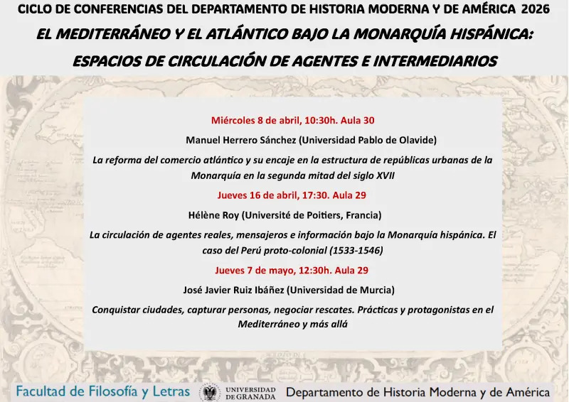 El grupo PAIDI HUM 680 les hace partícipes del ciclo de conferencias del Departamento de Historia Moderna y de América de la Universidad de Granada: El Mediterráneo y el Atlántico bajo la Monarquía Hispánica: Espacios de circulación de agentes e intermediarios. En él, participará nuestro IP Manuel Herrero Sánchez en la sesión del 8 de abril con su intervención titulada «La reforma del comercio atlántico y su encaje en la estructura de repúblicas urbanas de la Monarquía en la segunda mitad del siglo XVII».
