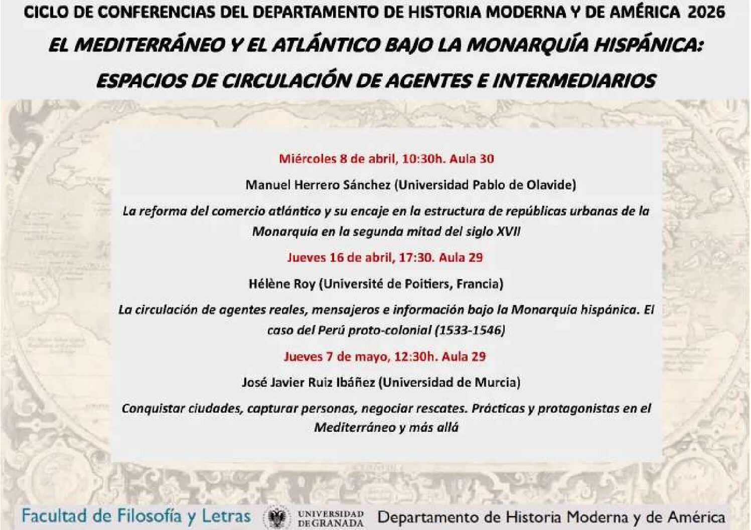 El grupo PAIDI HUM 680 les invita a la tercera sesión del ciclo de conferencias Europa, el mundo mediterráneo y su difusión atlántica (2026) que tendrá lugar el viernes 17 de abril a las 16:00h en la sala Enriqueta Vila Vilar de la EEHA (Calle Alfonso XII, 16, Sevilla).