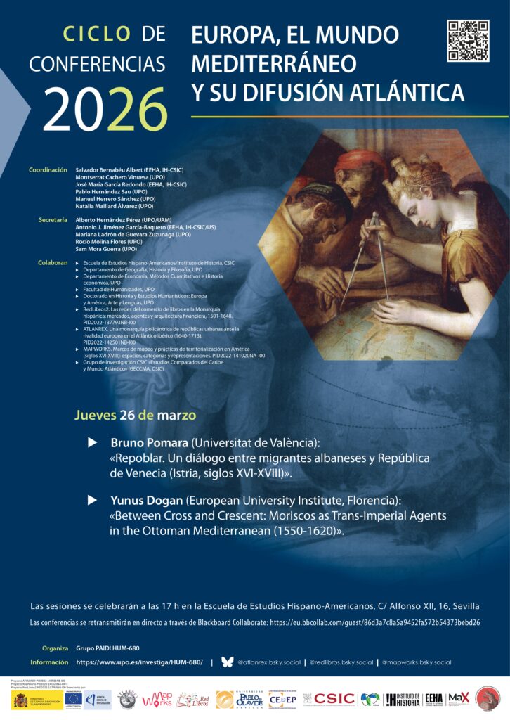 El grupo PAIDI HUM 680 les invita a la tercera sesión del ciclo de conferencias Europa, el mundo mediterráneo y su difusión atlántica (2026) que tendrá lugar el jueves 26 de marzo a las 17:00h en la sala Enriqueta Vila Vilar de la EEHA (Calle Alfonso XII, 16, Sevilla). Contará […]