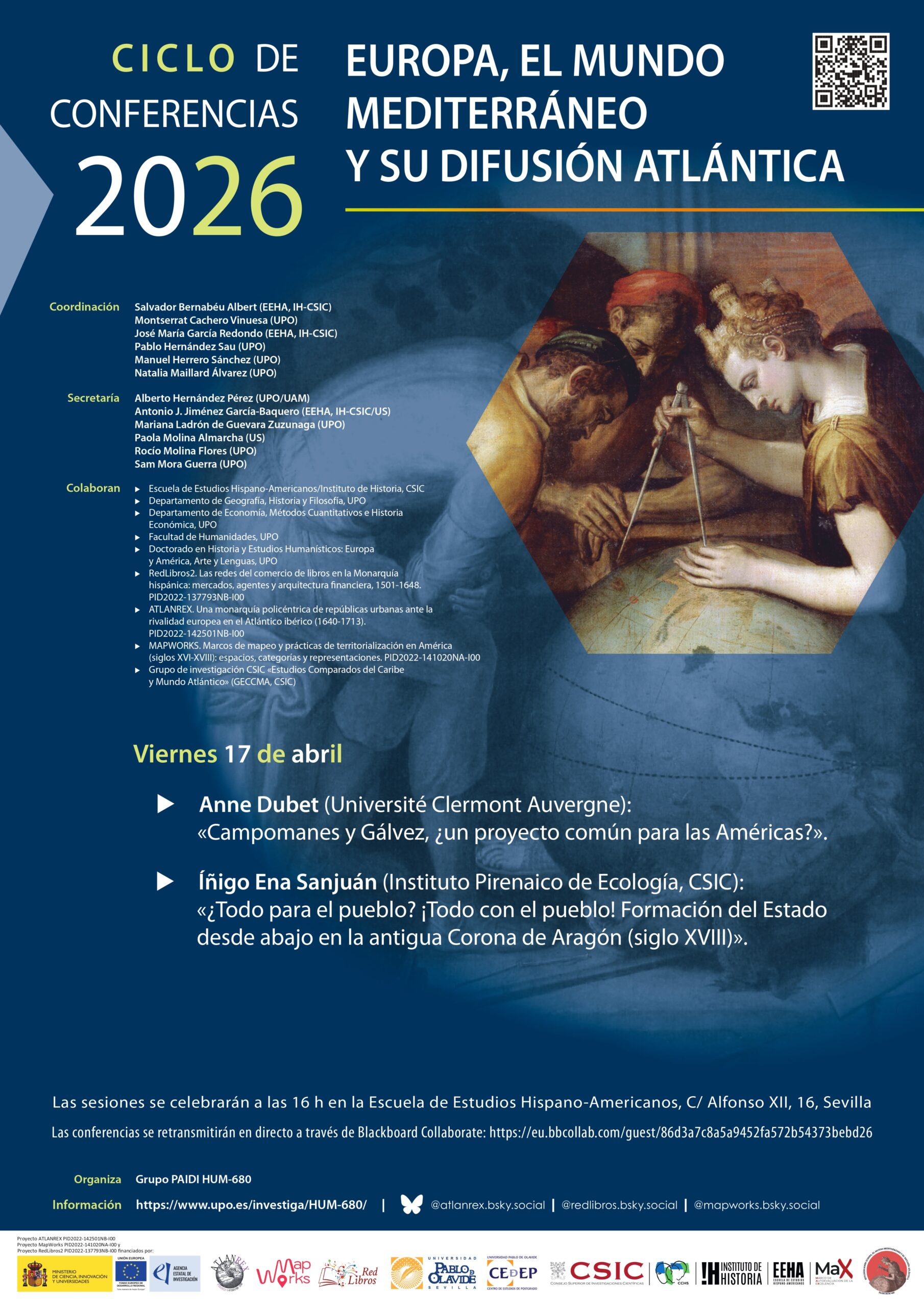 El grupo PAIDI HUM 680 les invita a la tercera sesión del ciclo de conferencias Europa, el mundo mediterráneo y su difusión atlántica (2026) que tendrá lugar el viernes 17 de abril a las 16:00h en la sala Enriqueta Vila Vilar de la EEHA (Calle Alfonso XII, 16, Sevilla).