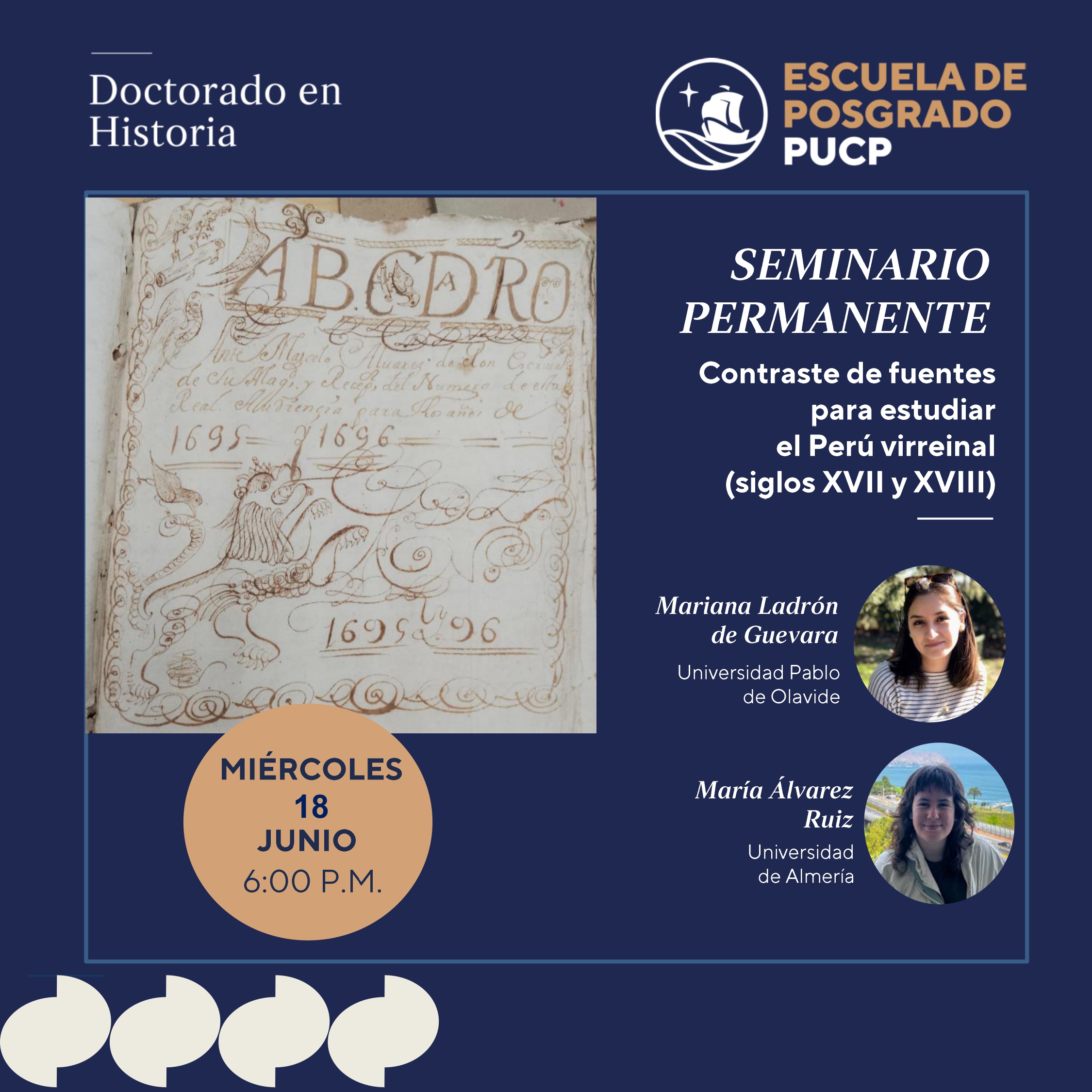 El grupo PAIDI HUM 680 les hace partícipes del Seminario Permanente del Doctorado en Historia de la Escuela de Posgrado de la Pontificia Universidad Católica del Perú que tendrá lugar el 18 de junio. En él, nuestra miembro Mariana Ladrón de Guevara Zuzunaga impartió un seminario junto con María Álvarez Ruiz (UAL) titulado “Contraste de fuentes para estudiar el Perú virreinal (siglos XVII y XVIII)”.
